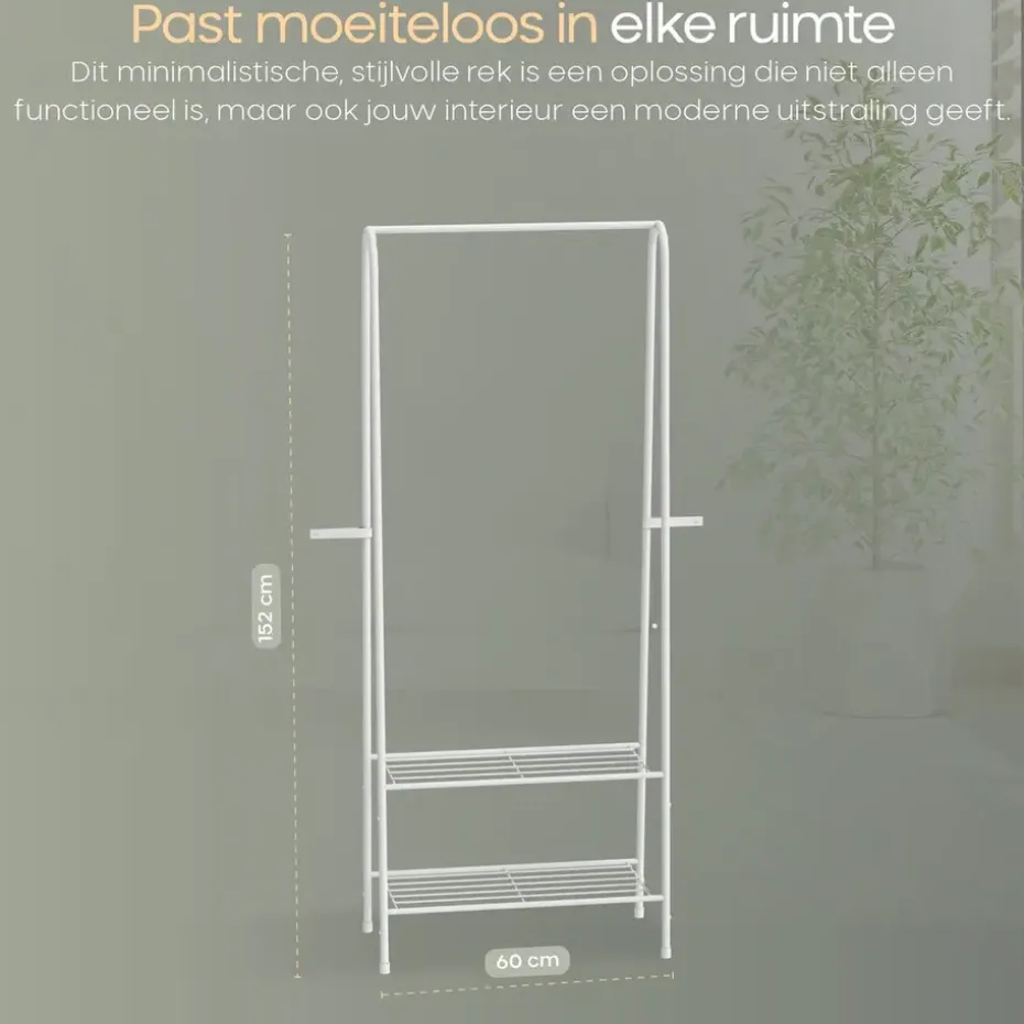Dit kledingrek biedt een combinatie van functionaliteit en esthetiek. Het is perfect voor mensen die efficiënt gebruik willen maken van beperkte ruimte, terwijl het ook een stijlvolle uitstraling toevoegt aan de kamer. Gebruik het in kleine appartementen, studentenkamers of zelfs als aanvulling in een inloopkast om je kleding netjes en overzichtelijk op te bergen.