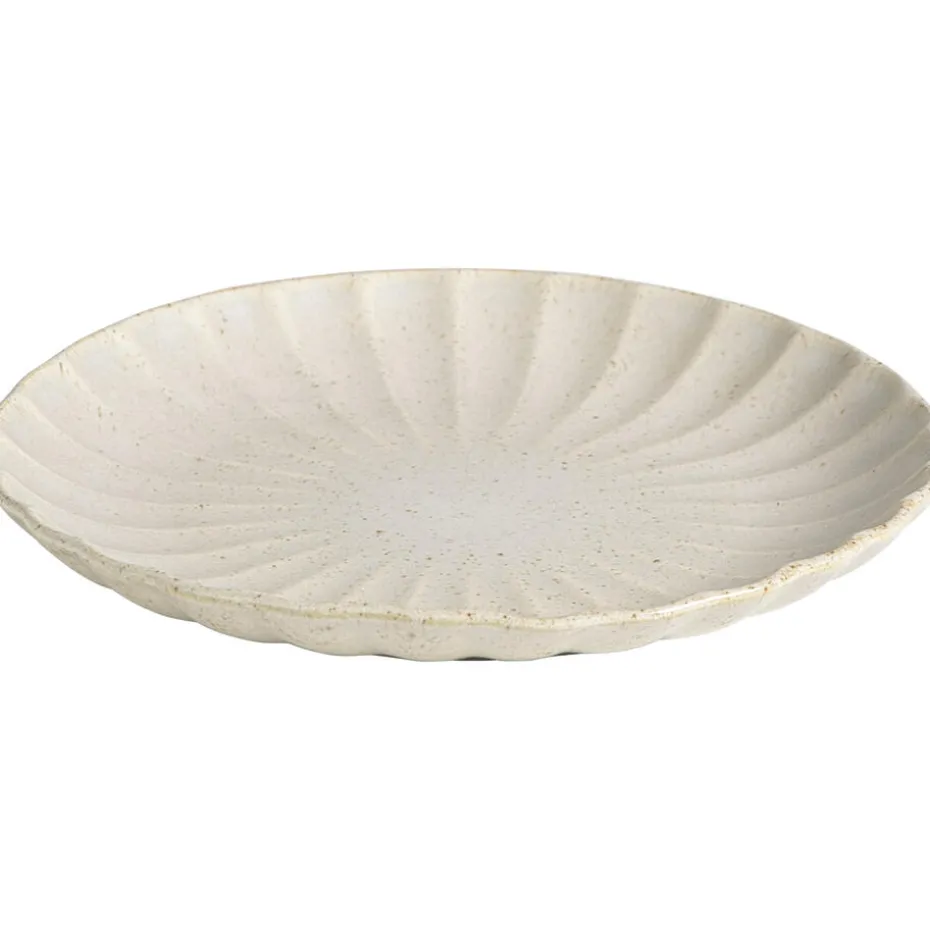 Ontbijtbord Flora is gemaakt van stoneware en uitgevoerd in een zachte off-white kleur die zorgt voor een rustige en natuurlijke uitstraling. Met een diameter van 21,5 cm is dit bord perfect voor het serveren van ontbijt, lunch of kleine gerechten. Het bord is voorzien van een verfijnd reliëf in cirkelvorm dat doet denken aan een schelpstructuur, wat zorgt voor een elegant en organisch design. Dankzij de tijdloze vormgeving en het subtiele glazuur past ontbijtbord Flora moeiteloos bij diverse tafelstijlen en is het zowel geschikt voor dagelijks gebruik als voor speciale momenten.