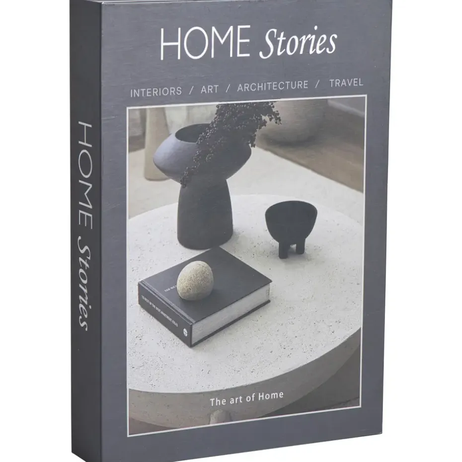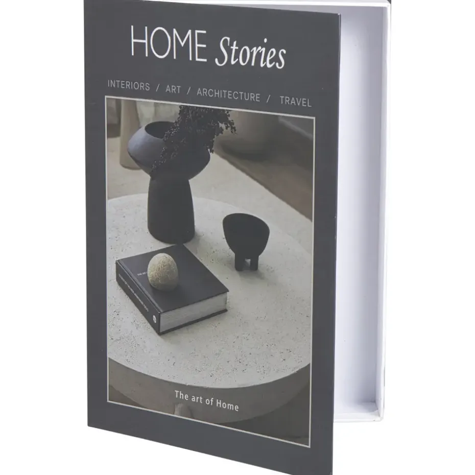 Opbergboek met een stijlvolle zwarte kaft en de titel At Home, zowel op de voorkant als op de rug van het boek. Op de voorkant is een sfeervolle interieurfoto afgebeeld die warmte en gezelligheid uitstraalt. Dit opbergboek combineert een modern design met functionaliteit en is perfect om kleine spullen zoals sleutels, notities of accessoires netjes en uit het zicht te bewaren. Dankzij het realistische boekontwerp past het naadloos in je boekenkast, op een dressoir of in een open kast. Een praktische en decoratieve oplossing voor een opgeruimd en stijlvol interieur.