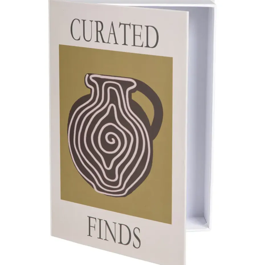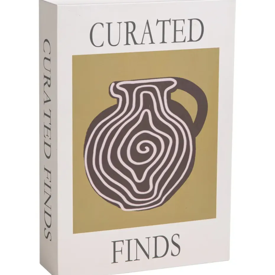 Opbergboek met de look van een echt boek en een stijlvolle, moderne uitstraling. Op de rug staat de tekst curated finds, wat zorgt voor een decoratieve en eigentijdse touch in je interieur. De voorkant toont een artistieke afbeelding van een kan in zwart-witte tinten, gecombineerd met een opvallend geel vlak dat het ontwerp net dat beetje extra geeft. Dit slimme opbergaccessoire is ideaal voor het netjes wegwerken van kleine spullen zoals afstandsbedieningen, sieraden of kantoorartikelen. Perfect voor gebruik in een boekenkast, op een bijzettafel of in een open vakkenkast. Een praktische én decoratieve oplossing voor een opgeruimd huis.