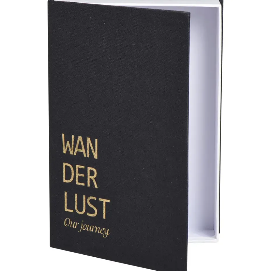Opbergboek met een stijlvolle zwarte kaft en de titel ”wanderlust – our journey”, zowel op de voorkant als op de rug van het boek. Dit geeft het boek een moderne en avontuurlijke uitstraling die perfect past in een eigentijds interieur. Het opbergboek is ideaal om kleine spullen zoals foto’s, souvenirs of persoonlijke accessoires netjes en veilig op te bergen. Dankzij het realistische boekdesign valt het nauwelijks op als opbergplek, waardoor je interieur netjes en georganiseerd blijft. Een praktische en decoratieve toevoeging voor iedereen die houdt van reizen en bijzondere herinneringen.