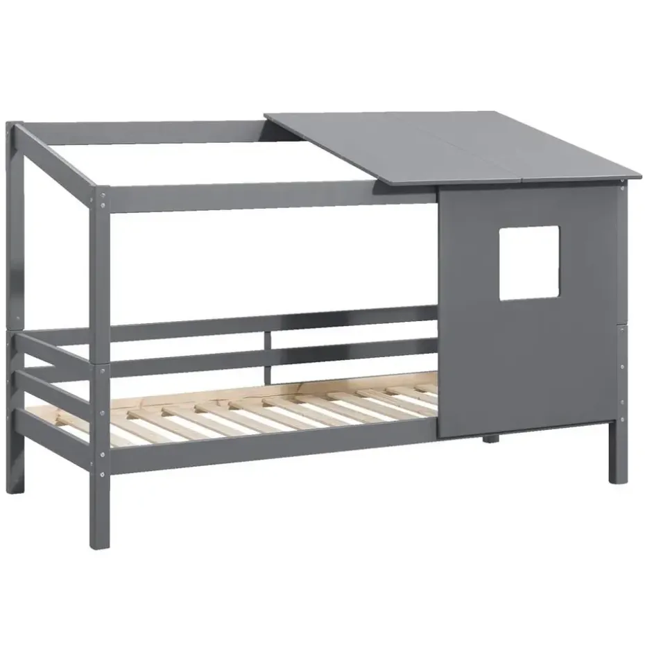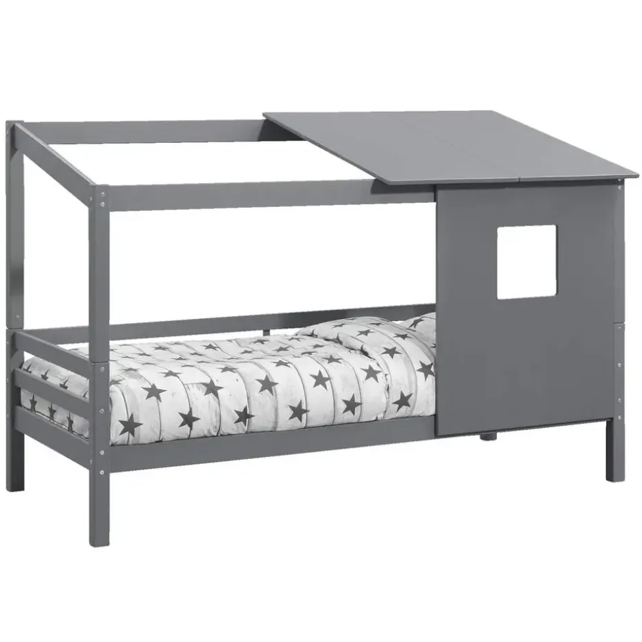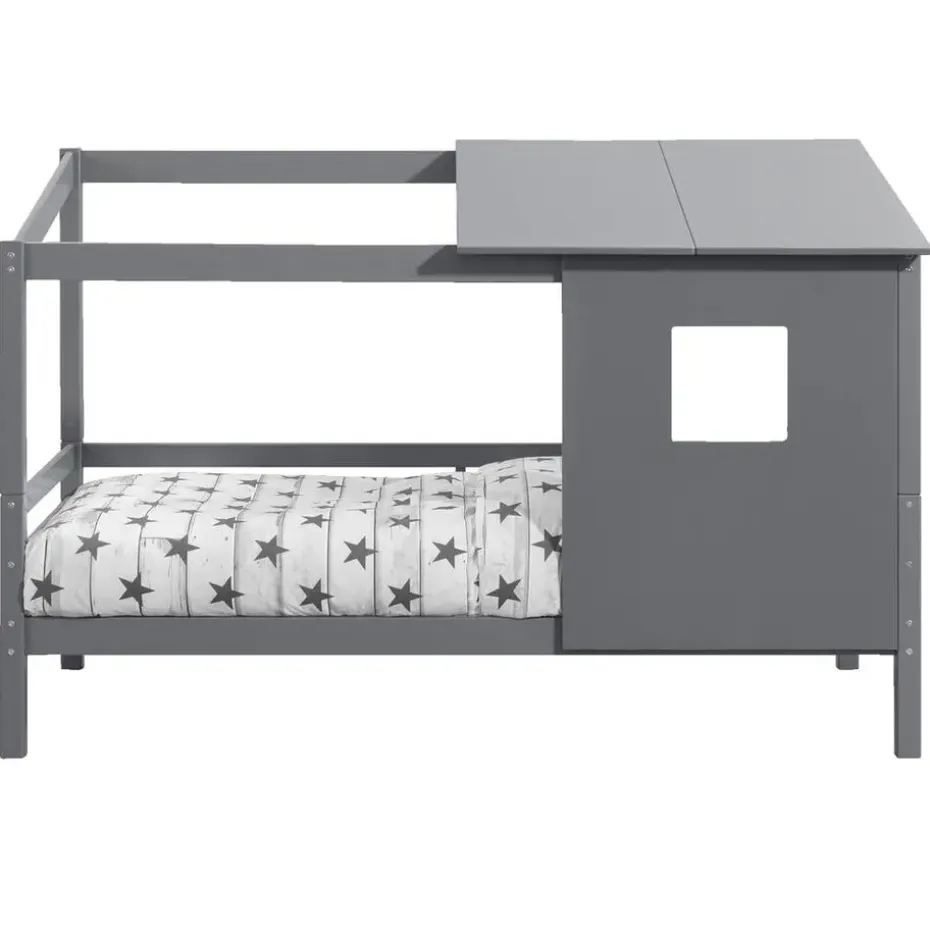 Opzetdak met wand Ties is grijs en gemaakt van massief grenenhout. Dit leuke opzetdakje met zijwand past perfect bij bed en halfhoogslaper Ties. Met dit dakje creëer je een leuk hutje voor je kind.