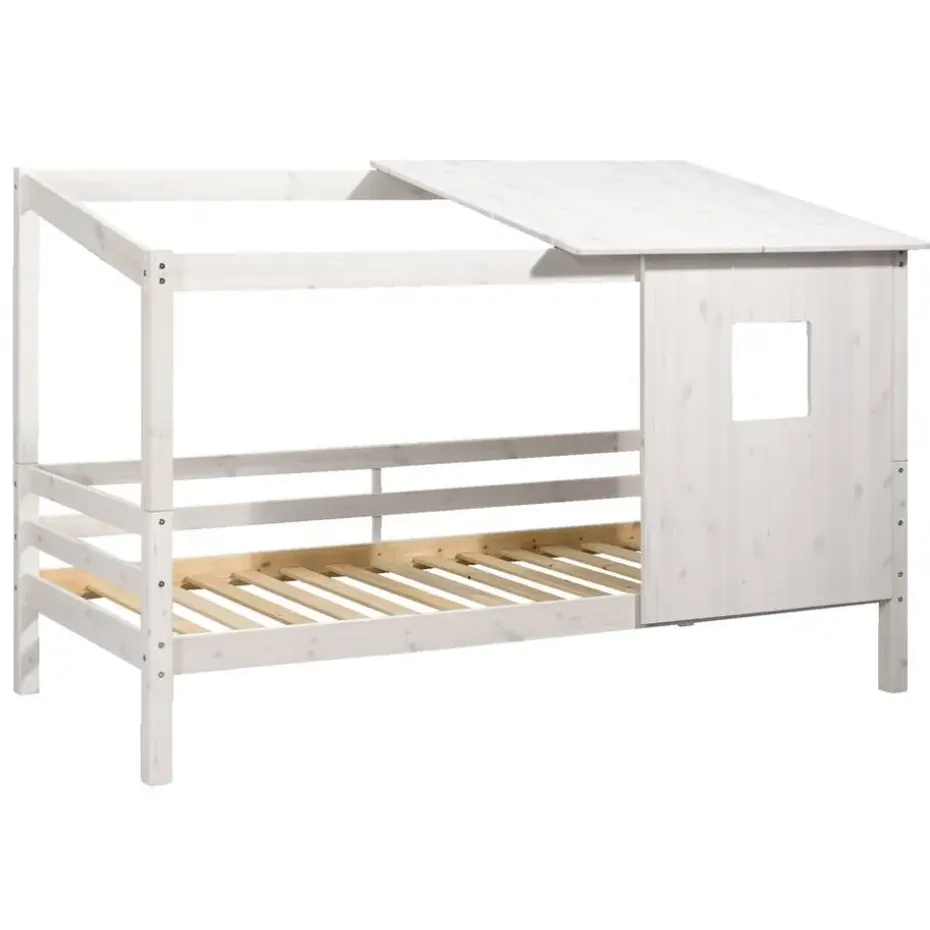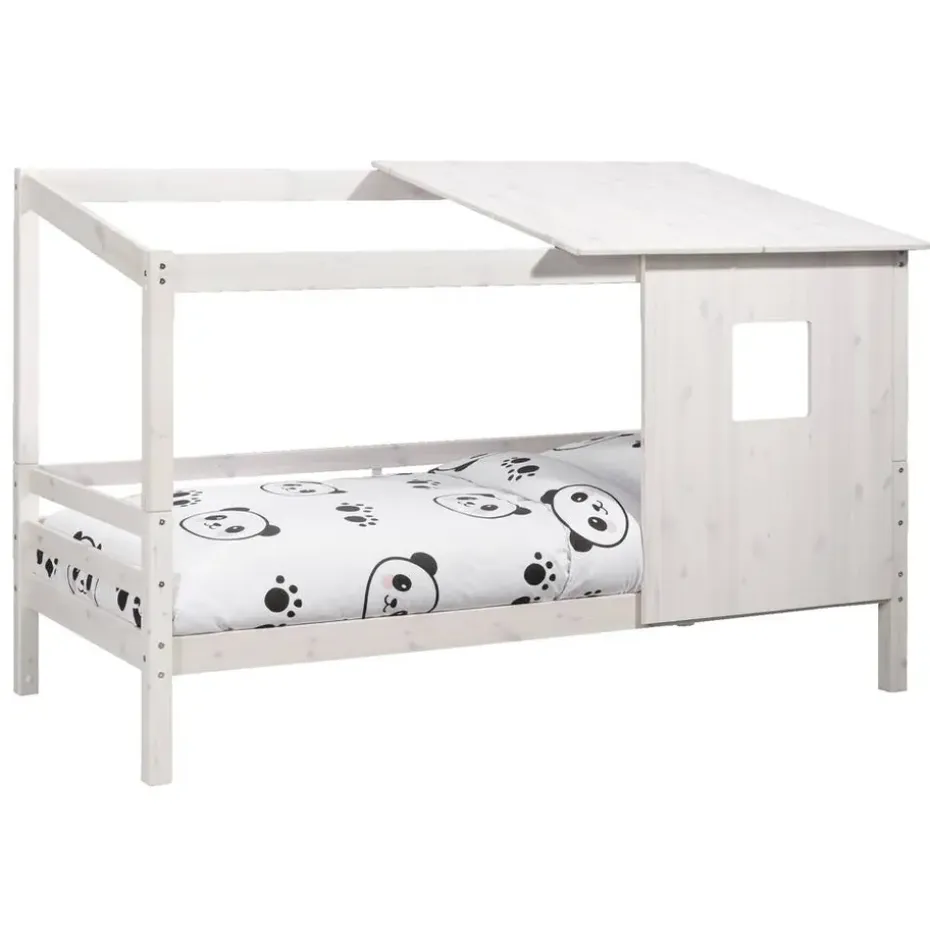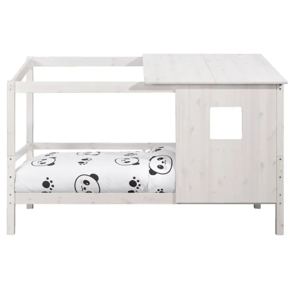 Opzetdak met wand Ties is in de kleur whitewash en gemaakt van massief grenenhout. Dit leuke opzetdakje met zijwand past perfect bij bed en halfhoogslaper Ties. Met dit dakje creëer je een leuk hutje voor je kind.