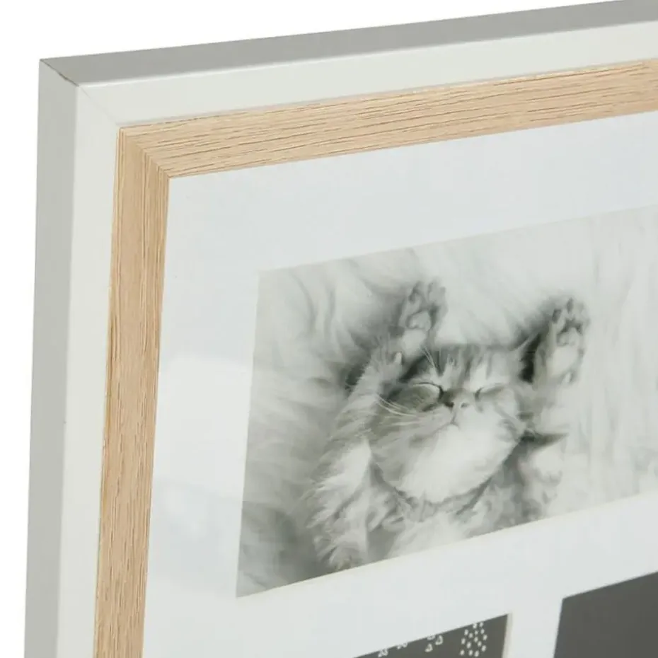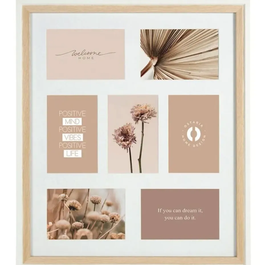 Collage fotolijst uit de NEO serie voor meerdere foto’s. Stel je foto’s tentoon met deze collage fotolijst in de kleur naturel hout met passe partout randen in de kleur wit. Deze moderne foto collage bestaat uit 7x fotolijstjes voor foto’s met afmetingen van 10 x 15 cm. Materiaal: hout/glas. Merk: Ostaria. Voorzien van ophangingen op deze op te hangen. Formaat: 42 x 49 cm. Wissellijst.