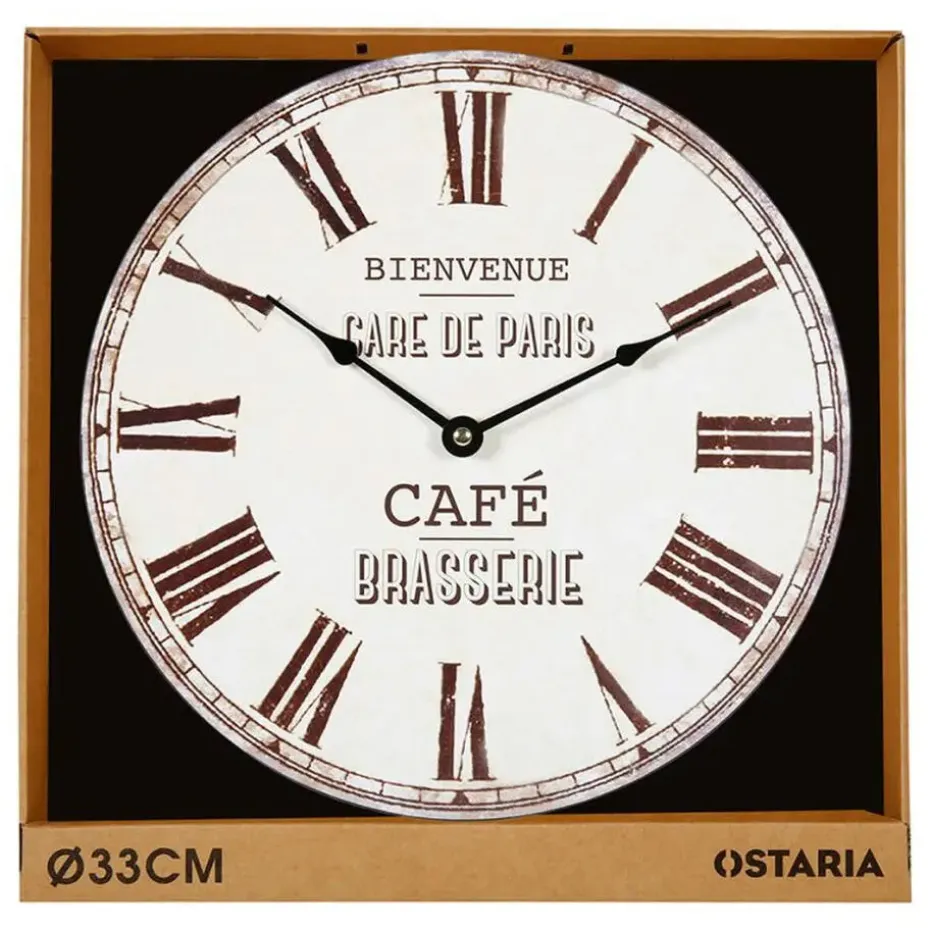 Haal de sfeer van een knus Frans cafe in huis met deze charmante Cafe Brasserie klok van Ostaria. De wijzerplaat heeft een vintage uitstraling met subtiele Franse details, terwijl het MDF in bruin tint voor een warme, huiselijke look zorgt. Met zijn formaat van 30 cm is hij perfect voor de keuken, eetkamer of een gezellige hoek in huis. Voeding: AA batterij (niet inbegrepen).