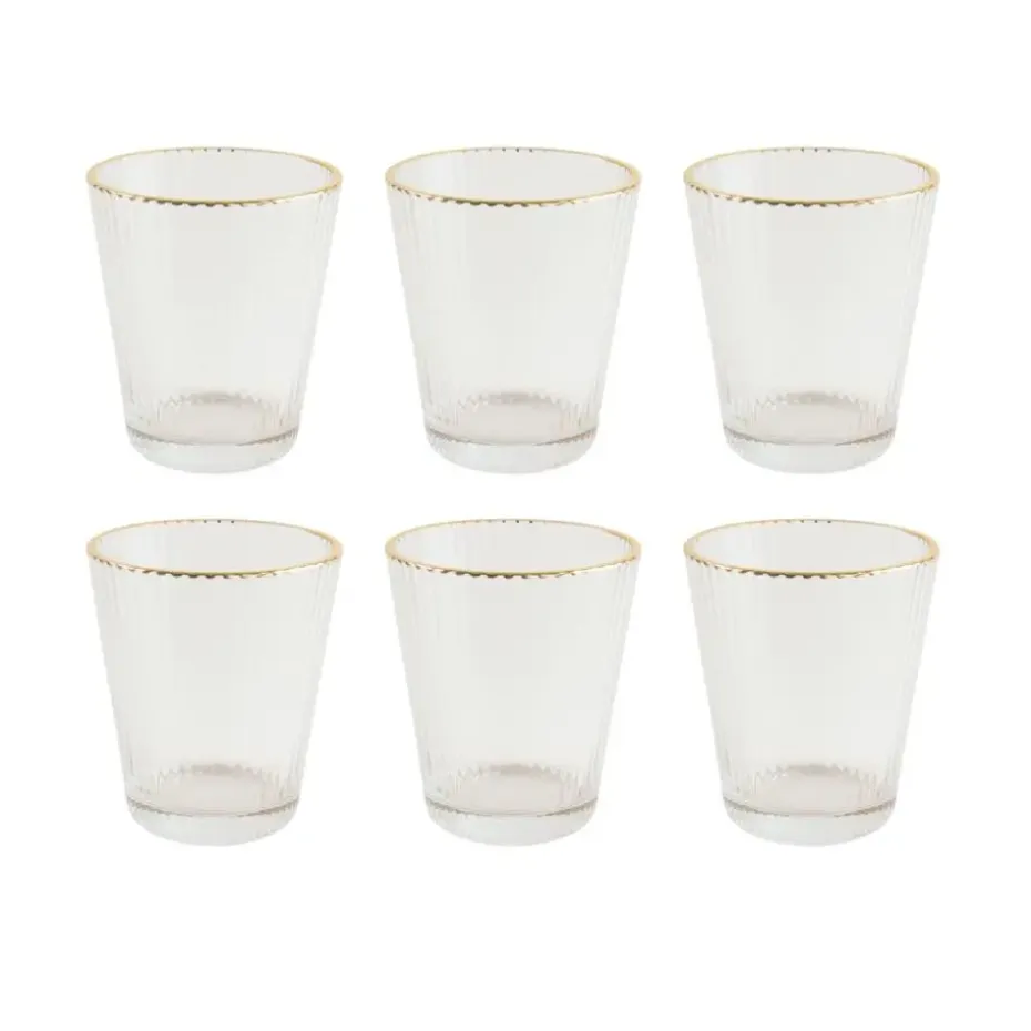 Deze set van zes OTIX waterglazen biedt niet alleen een verfrissend drankje, maar is ook een stijlvolle toevoeging aan je tafelservies. Met een inhoud van 350 ml zijn de glazen ideaal voor een verfrissende slok water, sap, frisdrank of cocktails. De gouden rand en reliëf ribbel geven de glazen een elegant tintje. Bovendien zijn de glazen stapelbaar, waardoor ze gemakkelijk op te bergen zijn en ruimte besparen in je keukenkastje.