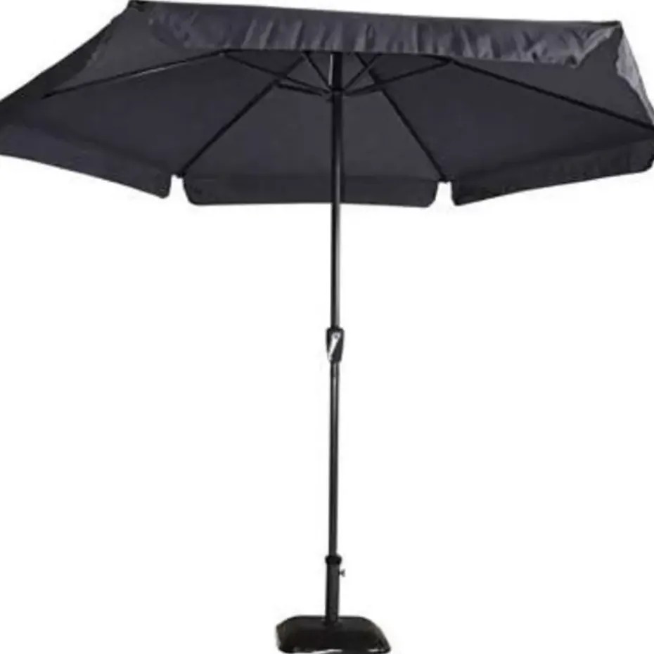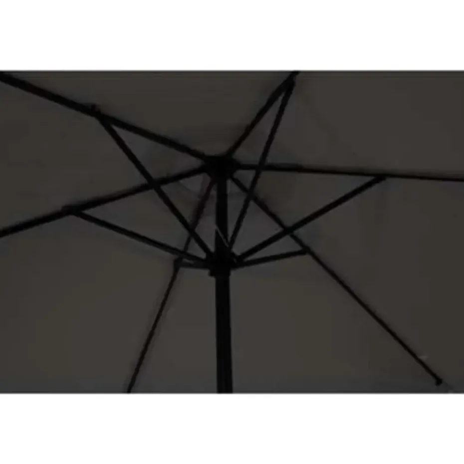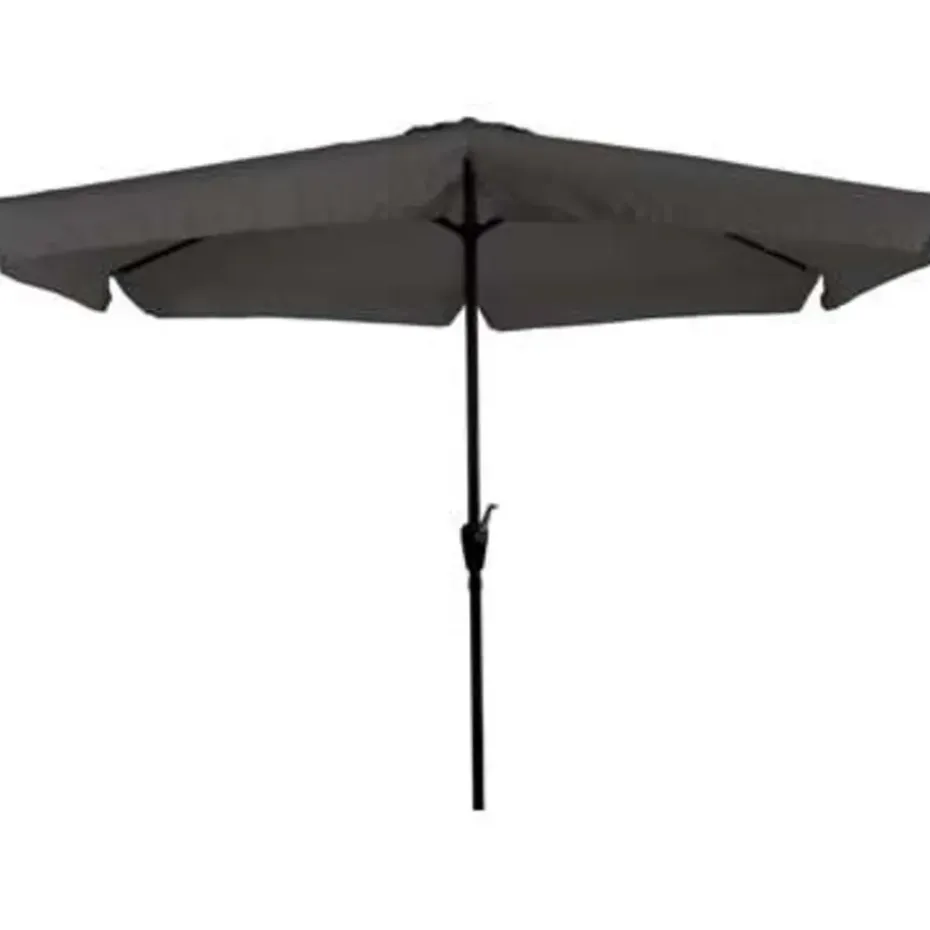 De parasol heeft een ronde vorm (zeshoek) met 6 metalen baleinen en volan. Het doek is gemaakt van stevig 180g/m² polyester in de kleur grijs. De parasol heeft een handige molen waarmee je ‘m eenvoudig open- en dichtdraait.
