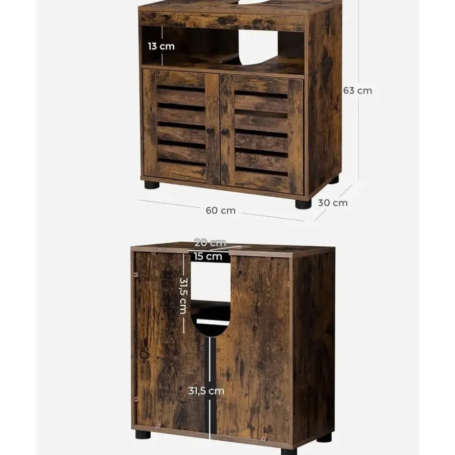 Met afmetingen van 60 x 30 x 63 cm past deze kast perfect onder je wastafel. De opening van 20 x 15 cm biedt ruimte voor de sifon, terwijl de rest van de kast ideaal is voor het opbergen van schoonmaakmiddelen en andere benodigdheden.