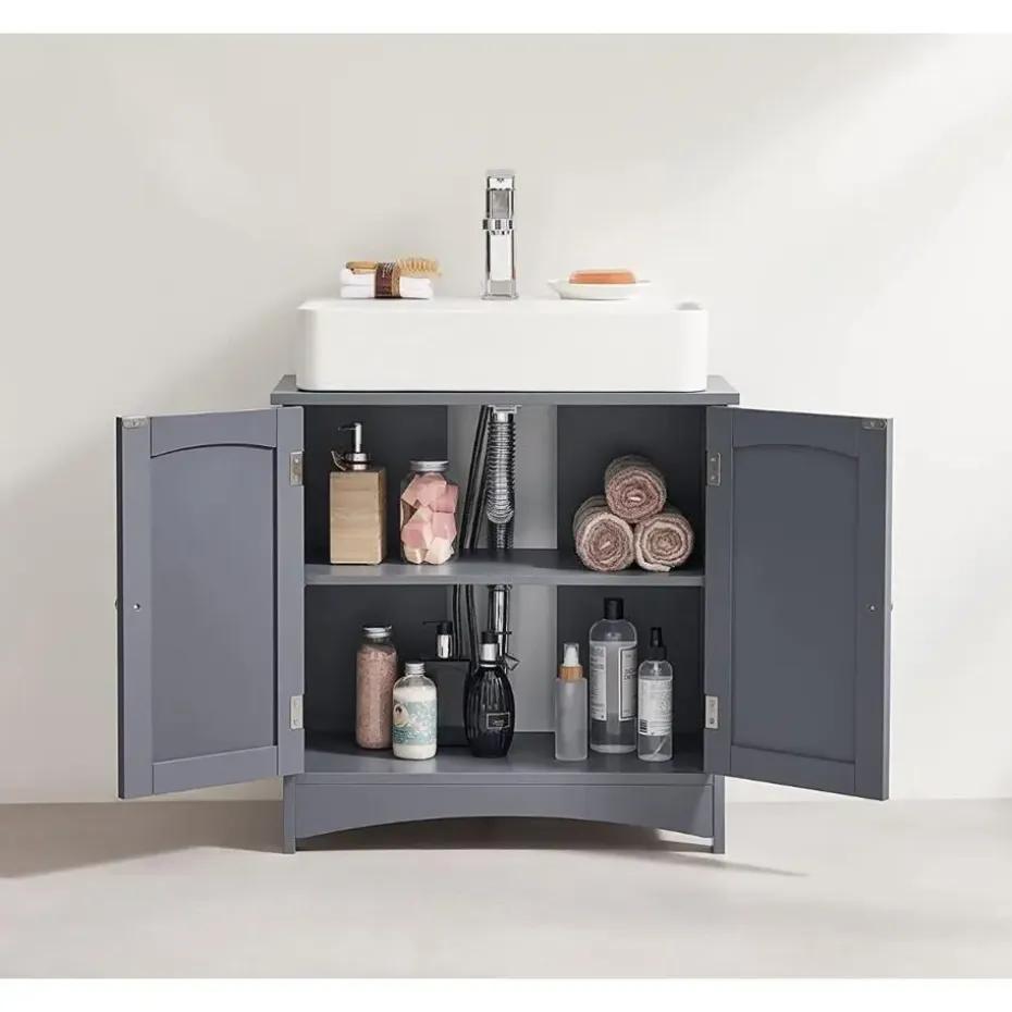 Geef uw huis een moderne sfeer met deze grijze badkamerkast. De kast is voorzien van schimmelbestendig materiaal en is eenvoudig schoon te maken. De kast heeft een grootte van: 60 x 30 x 60 cm (L x B x H). De handige dubbele deuren beschermen handdoeken, papier en vele andere badkamerbenodigdheden tegen water.