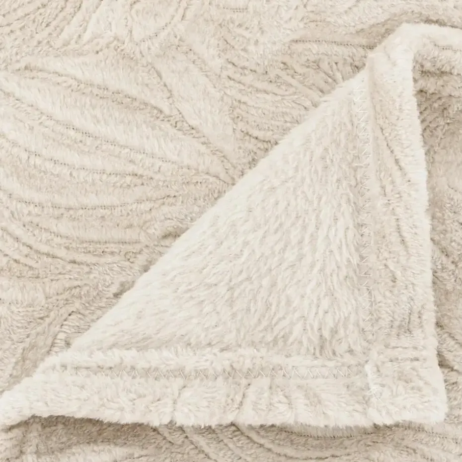 Plaid, bedsprei en/of Bankdeken, type Leafes uni kleur met zachte fleece stof met een jungle leafs motief, in de warme kleur beige. Heerlijk warme 2 persoons deken voor als het koud is. Naast dat deze deken/plaid perfect is voor de winter, is deze ook leuk als bedsprei, of ter decoratie over de armleuning van de bank of fauteuil. Formaat circa: 180 x 230 cm. Materiaal: polyester. Wasvoorschrift: 30 graden machinewas. Reliefbladpatroon. De intensiteit van het patroon varieert afhankelijk van het licht.