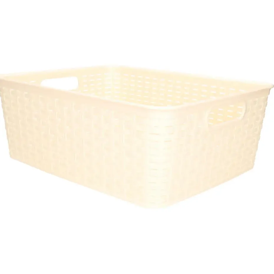 Opbergmand/kastmand gemaakt van rotan gevlochten kunststof in de kleur zacht geel. Deze manden zijn kast-organisers of zijn prima in de woonkamer, badkamer, keuken of slaapkamer plaatsen. De mandjes zijn bijvoorbeeld geschikt voor het opbergen van speelgoed, kleding stukken, kantoor spullen, etenswaren en het opbergen van diverse spullen. Formaat: ongeveer 30 x 37 x 13 cm. Inhoud: 12 liter.