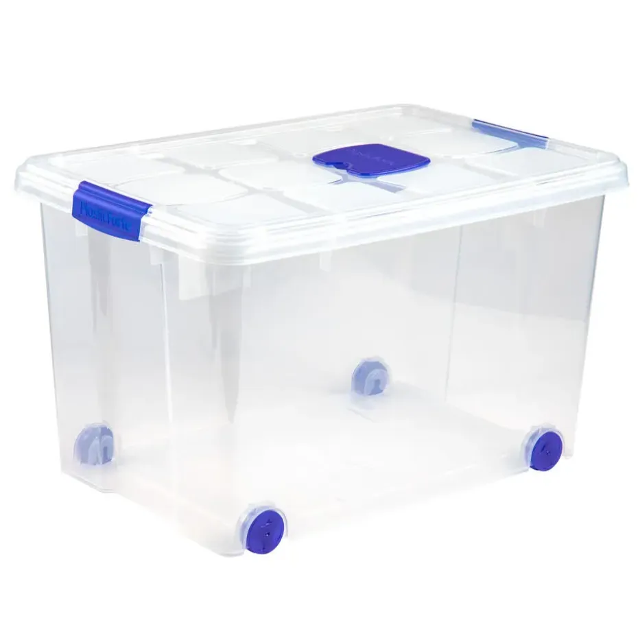 Opslagbakken / Opslagboxen organizers op wielen met deksel met een inhoud van 55 liter. Transparante opbergbakken met deksel welke is voorzien van sluitclips. Handig voor het opbergen van spullen. Inhoud: ca. 55 liter. Formaat: 59 x 40 x 35 cm. Materiaal: kunststof (plastic).