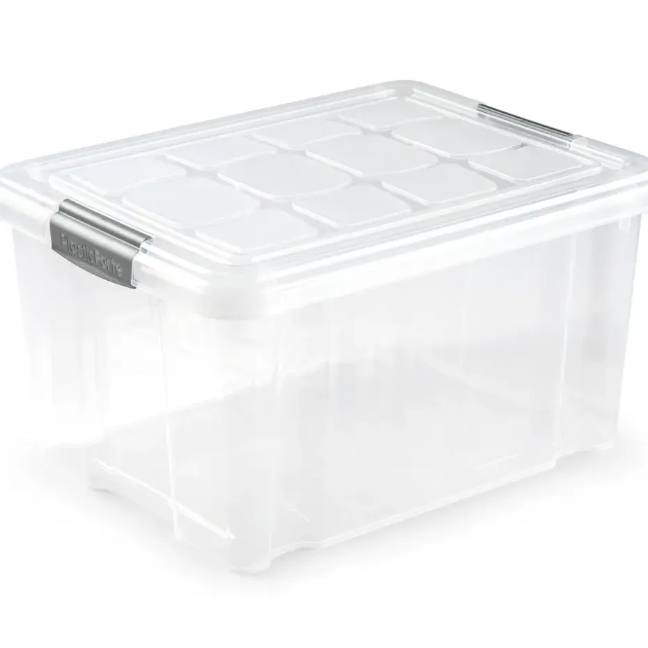 Opslagbakken/organizers van stevig kunststof met deksel. Transparante opbergbakken met deksel welke is voorzien van grijze sluitclips. Handig voor het opbergen van spullen. Inhoud: ca. 25 liter. Formaat: 42 x 36 x 25 cm. Materiaal: kunststof (plastic).