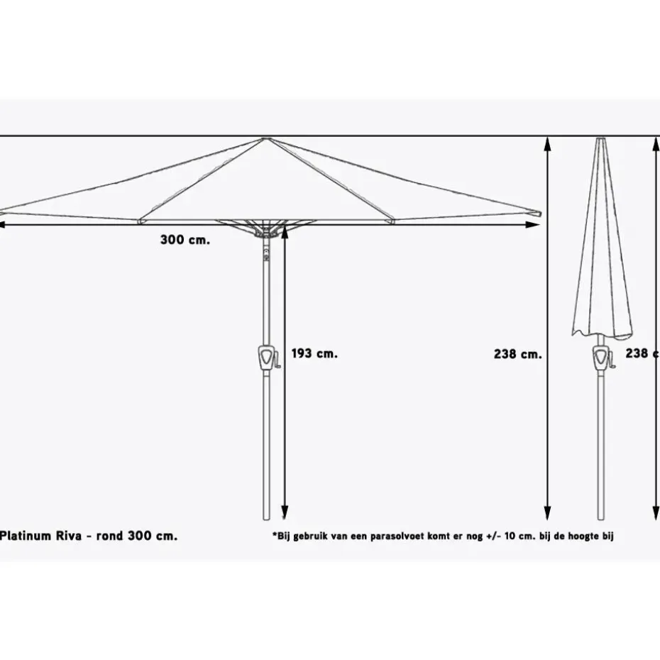 Met de Platinum Riva parasol kan je een heerlijke schaduwplek creëren. De Riva parasol is rond en heeft een doorsnede van 3 meter. Doormiddel van het handige opdraaimechanisme kan je de parasol eenvoudig in- en uitklappen. De mast van de Riva bestaat uit twee delen. Dit zorgt ervoor dat je de parasol uit elkaar kan halen en gemakkelijk kunt opbergen.