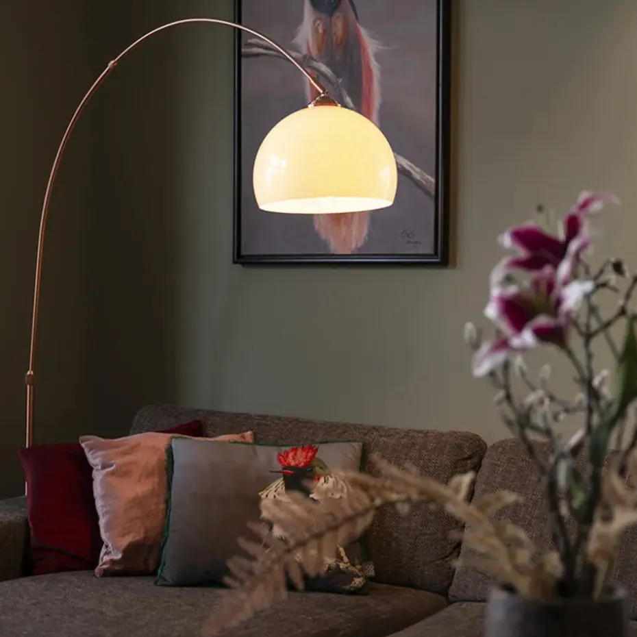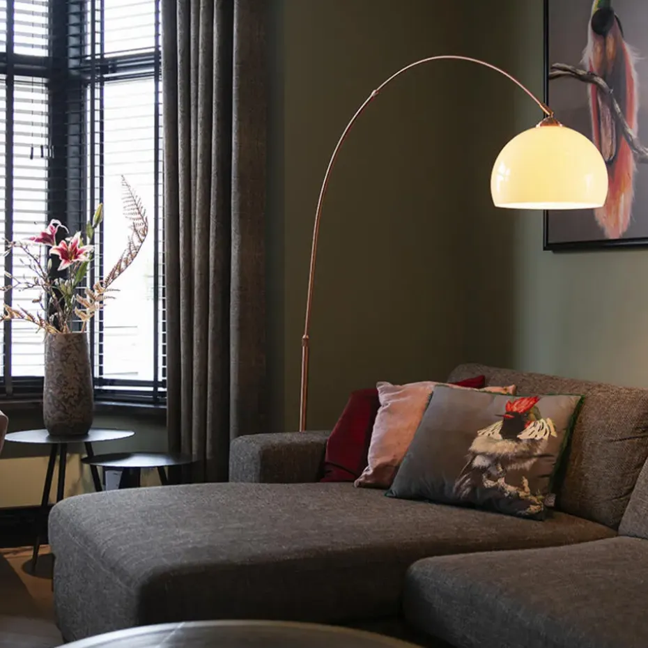 Gezellige booglamp in koper met een witte kap. De Arc Basic heeft een uitgesproken minimale uitstraling met zijn koperen basis in combinatie met de witte lampenkap. Een booglamp zorgt voor zowel functioneel als sfeerlicht in de woonkamer. Deze lamp heeft een totale hoogte van 176 cm en een lengte van 130 cm. De voet van de lamp heeft een diameter van 30 cm. De boog is op twee plaatsen verstelbaar, zo bepaal je zelf de hoogte en overspanning. De kunststof kap geeft een gezellige sfeer in huis. De lamp wordt exclusief lichtbron geleverd. Met een lichtbron met een E27 fitting (max. 20 Watt) maak je je booglamp helemaal compleet. De lamp is tevens dimbaar met een externe dimmer (dimmer niet inbegrepen). Zorg voor een aangename sfeer met de Arc Basic!