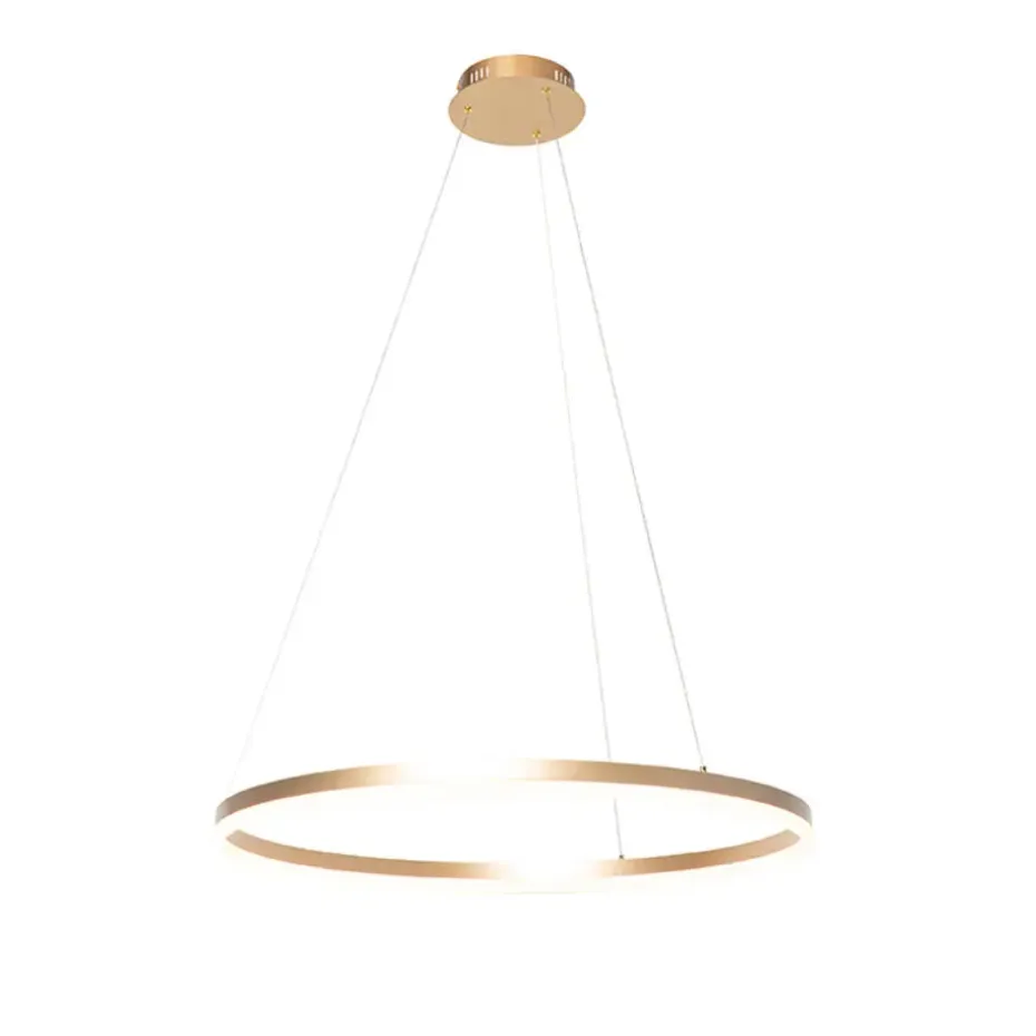 Een strakke en moderne hanglamp is deze Anello. De bovenkant van de ring is goud en de onderkant bestaat uit een ingebouwde LED ring. De LED ring heeft 53 Watt, 2.700 Kelvin en geeft 6777 lumen. Deze hanglamp heeft een heel speciaal ingebouwd dimsysteem. De lamp is drie staps dimbaar. Dat wil zeggen dat je zelf je dimstand kan kiezen. Op stand 1 schijnt de lamp voor 100%, op stand 2 voor 60% en stand 3 is enorm gezellig licht: dan schijnt de lamp nog maar voor 30%. Wanneer je op de schakelaar drukt laat de lamp zijn range van standen automatisch zien. Door nogmaals op de schakelaar te drukken kies je een lichtstand uit, hiermee gaat ook de lamp uit. Druk je hierna nog een keer op de schakelaar heeft de lamp de door jou gekozen lichtstand. Deze ring heeft een diameter van 80 cm en is ook verkrijgbaar in 40 cm en 60 cm. Hij is verstelbaar in hoogte, minimaal 38 cm en maximaal 120 cm. Een modern pareltje voor jouw woning!