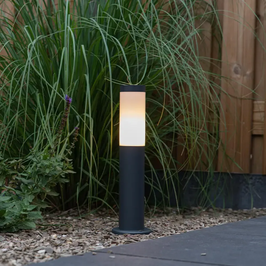 Rox buitenlamp is afgewerkt in RVS in een antraciet grijze kleur. De Rox hoort echt thuis in een moderne omgeving. Deze buitenlamp komt het best tot zijn recht wanneer je er enkelen naast elkaar zet. Zo creëer je het beste licht in jouw tuin! Door de donker grijze kleur geeft hij nog een extra moderne touch. Hij is 45 cm hoog en heeft een diameter van 7.5 cm. De voet aan de lamp heeft een diameter van 11.5 cm. De lamp is dimbaar (dimmer niet inbegrepen) om een gezellige sfeer in de tuin te hebben wanneer het in de avond begint te schemeren. Door de IP-waarde van IP44 is hij spatwaterdicht, dus echt geschikt voor buiten. Door een lichtbron passend in een E27 fitting (max. 20 Watt) erbij te bestellen maak je deze buitenlamp af. Een moderne lamp met een strakke uitvoering, wie wil die nu niet?