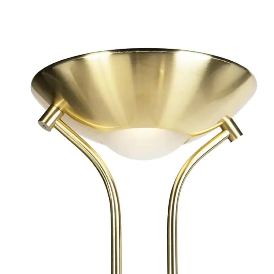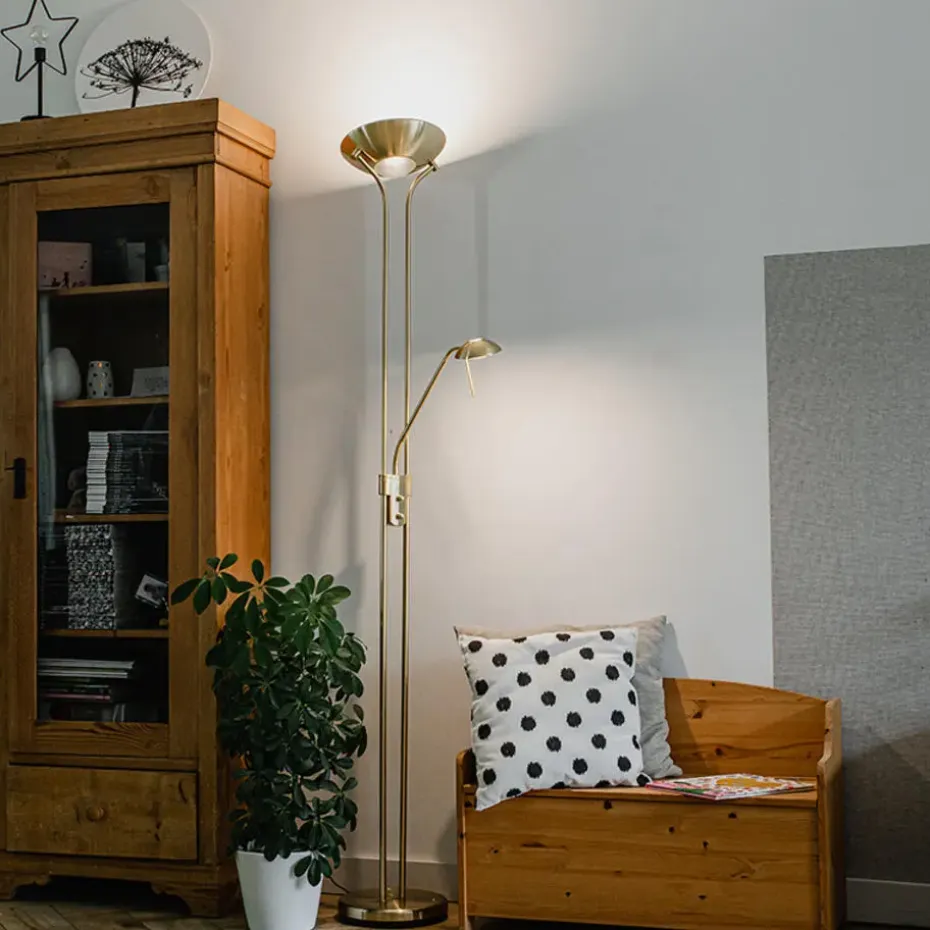 De Diva 2 goud heeft een prachtig uiterlijk zoals je bij een naam als Diva kunt verwachten. Deze uplighter is tevens voorzien van een tweede lichtbron in de vorm van een super handige leeslamp, twee vliegen in één klap dus! Deze leeslamp is voorzien van een flexarm, en is dus volledig richtbaar waar je maar wil. De lamp is dimbaar op het frame waardoor je perfect de geschikte sfeer kunt creëren. Ideaal voor gebruik in je woonkamer. De lamp heeft een totale hoogte van 180 cm. De voet een diameter van 25 cm. Hij wordt met kabel geleverd waarvan de lengte maximaal 190 cm is. De lamp beschikt over geïntegreerd LED (niet-vervangbaar). De leeslamp beschikt over 500 lumen en 3000 Kelvin. Met 20.000 branduren zal hij erg lang branden in jouw huis! De ring bovenaan de lamp beschikt over 1800 lumen en 3000 Kelvin. Geef een moderne touch aan je interieur met deze Diva 2!