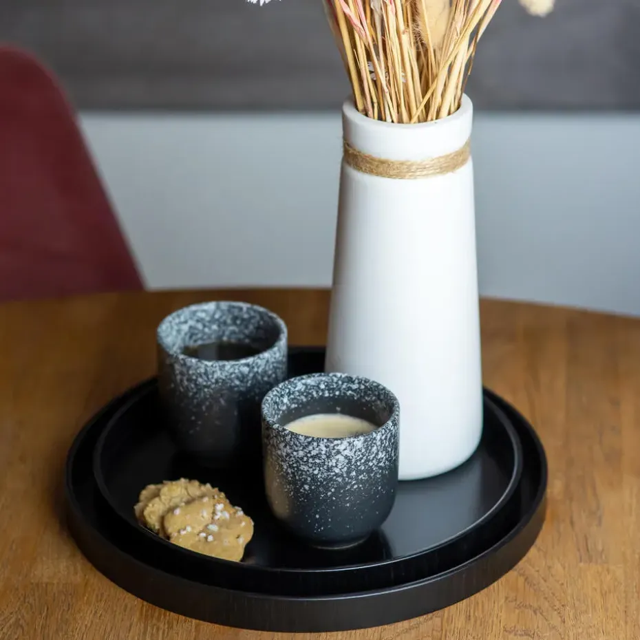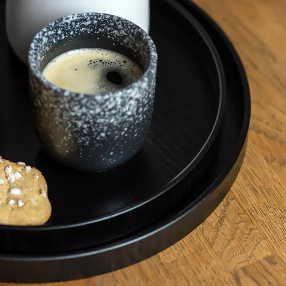 Dit dienblad in het zwart is een elegante verschijning op tafel. De combinatie van de zwarte kleur met het houten materiaal zorgt ervoor dat het dienblad goed bij diverse woonstijlen past. Het dienblad is zowel elegant als stoer. Heb je het dienblad niet nodig om drankjes en hapjes te serveren? Zet wat mooie woondecoratie op het blad en gebruik het als extra decoratie in jouw interieur. Zo komt dit houten ronde dienblad altijd wel van pas.