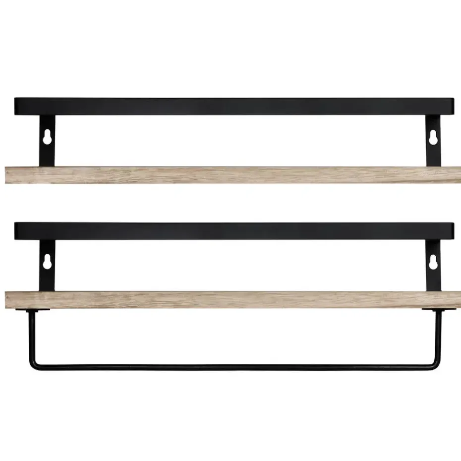 Dit wandrek heeft een industrieel design en past in elk huishouden. Het design is strak en straalt warmte uit. De stijlvolle planken zijn gemaakt van hout en zijn vocht- en hittebestendig. De wanddecoratie bestaat uit twee lagen, die los van elkaar op te hangen zijn. De industriële, matzwarte beugels en de handdoekstangen zijn gemaakt van metaal. Dit biedt extra stevigheid. De hangers kunnen aan de onderkant van de drijvende wandplanken bevestigd worden.