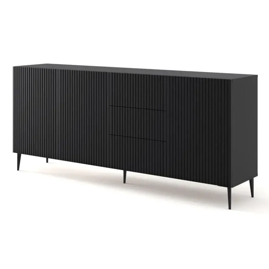 De meubels uit de Ravenna-collectie kenmerken zich door elegantie en een unieke uitstraling. Ze zijn geschikt voor moderne, Italiaanse en minimalistische interieurontwerpen. De eenvoudige vormen en greeploze fronten passen perfect bij subtiele frezingen. Deze bijzondere versieringen transformeren de sfeer van een woonkamer of eetkamer met een opvallend design dat aansluit bij de nieuwste trends. Metalen poten ondersteunen het corpus en bieden stabiliteit en voegen een uitgesproken karakter toe. De Ravenna-serie biedt niet alleen stijlvol design, maar ook hoge kwaliteit, functionaliteit en gebruiksgemak. De meubels zijn uitgerust met een “push to open” systeem voor comfortabel openen.