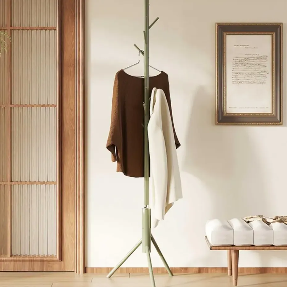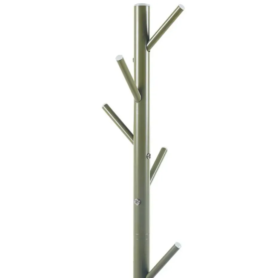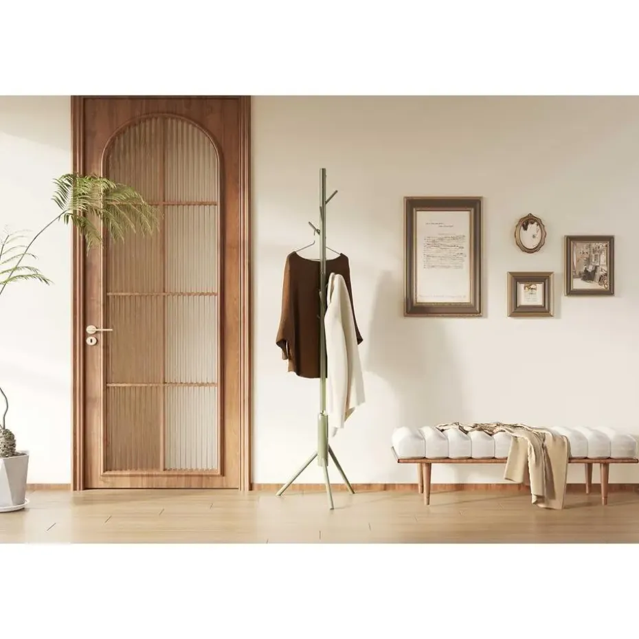 De kapstok uit de Kassie-reeks is een stijlvol en functioneel meubelstuk, perfect voor elke moderne hal of entree. Het design is strak en minimalistisch, uitgevoerd in groen metaal, wat een eigentijdse en frisse uitstraling geeft aan je interieur. Dankzij de robuuste constructie biedt deze kapstok voldoende stabiliteit, zelfs wanneer alle haken in gebruik zijn.