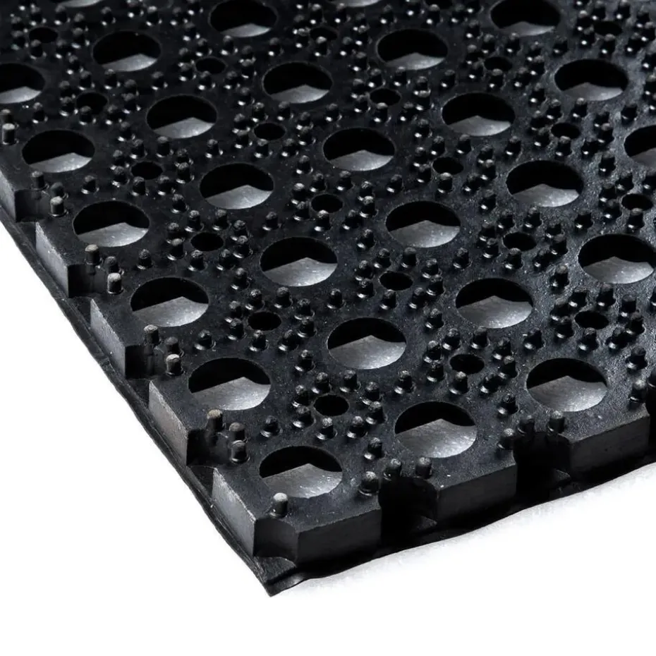 Een ringmat is zowel binnen als buiten te gebruiken. De open bodem zorgt voor een goede afvoer van vloeistoffen en vuil. Dat is niet alleen praktisch bij je entree, maar ook veilig op plaatsen waar de vloer vaak nat is. Doordat de mat van natuurlijk rubber is gemaakt, heeft deze een goede antislip werking, zelfs op koude en natte winterdagen. Tot slot heeft rubber een (geluid)dempende en isolerende werking. Schoonmaken van de ringmat kan heel gemakkelijk door deze uit te kloppen of af te spuiten met een tuinslang/hogedrukspuit.