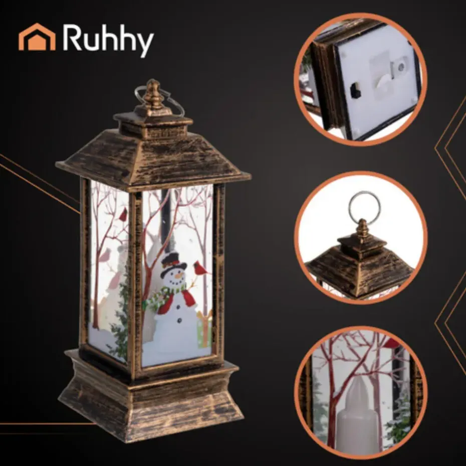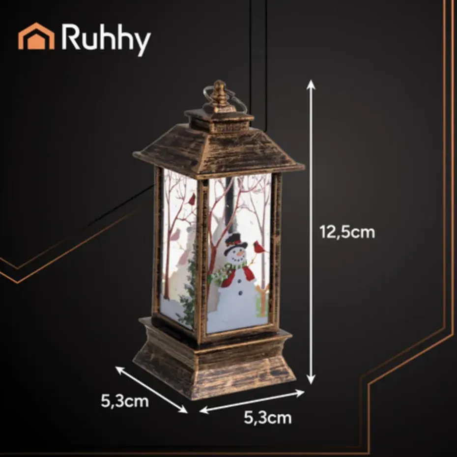 Kerstlantaarn van Ruhhy. Deze elegante RUHHY LED-lantaarn in goud/zwart voegt een stijlvol en sfeervol accent toe aan uw kerstversiering. Binnenin imiteert een energiezuinige LED-kaars op batterijen een warm, gezellig en volkomen veilig licht, zonder open vlam. Versierd met fijne kerstmotieven, creeert dit ornament direct de magie van de feestdagen in elke ruimte. Dankzij het draadloze ontwerp en de compacte afmetingen (12 x 5 x 5 cm) kan de lantaarn overal worden geplaatst, van de vensterbank tot de kersttafel.