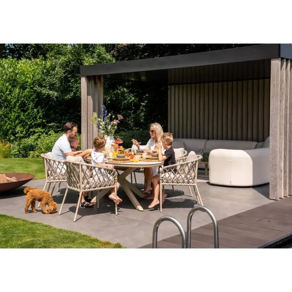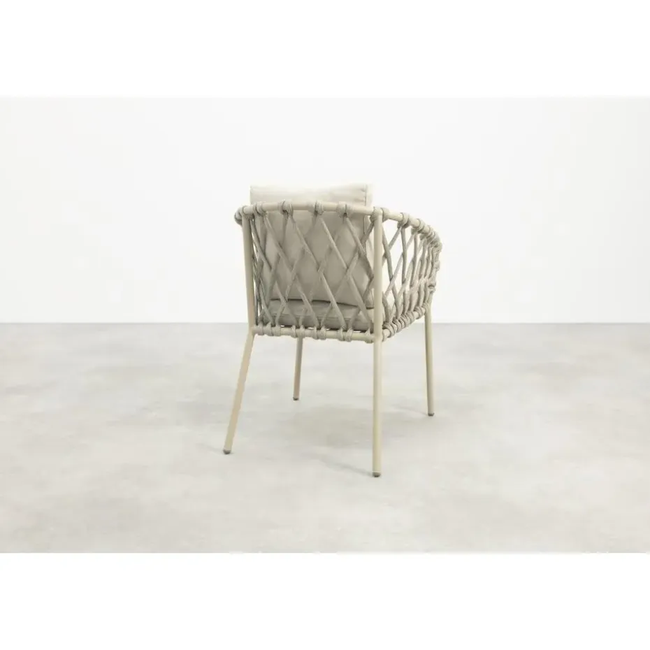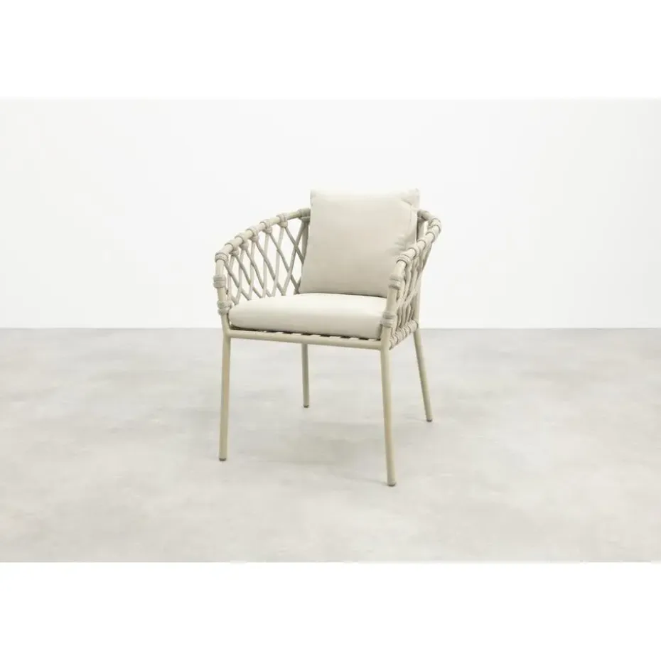 De Sara stoel is licht van gewicht, stevig en gemaakt voor buiten. Het aluminium frame in latte geeft een zachte, moderne uitstraling die makkelijk te combineren is met andere tuinmeubels. Het touwwerk (rope) in zandkleur zorgt voor een speelse, luchtige look, en de dikke kussens bieden top zitcomfort. Alles bij elkaar: een stijlvolle én praktische keuze voor wie graag buiten geniet in stijl.