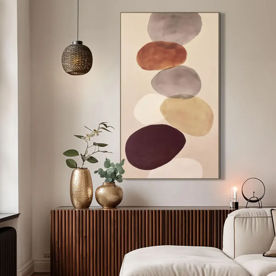 Schilderij Gekleurde Stenen FCL meet 118×70 cm en is een sfeervol wanddecoratie-element met een rustgevende uitstraling. Het kunstwerk toont licht abstract gestapelde keien in aardse tinten, wat zorgt voor een natuurlijke en harmonieuze sfeer in huis. Het schilderij is vervaardigd van FCL (Fine Canvas), een materiaal dat bekend staat om zijn lichte gewicht en strakke afwerking, waardoor het eenvoudig op te hangen is. De mooie MDF lijst rondom het werk voegt warmte toe en geeft het geheel een afgewerkte en kwalitatieve uitstraling. Dankzij het grote formaat komt het kunstwerk goed tot zijn recht boven een bank, dressoir of eettafel. De combinatie van natuurlijke kleuren en een organisch onderwerp zorgt ervoor dat dit schilderij zich makkelijk laat combineren met verschillende interieurstijlen. Als je op zoek bent naar rust, warmte en stijl aan de muur, dan is schilderij Gekleurde Stenen FCL een goede keuze.