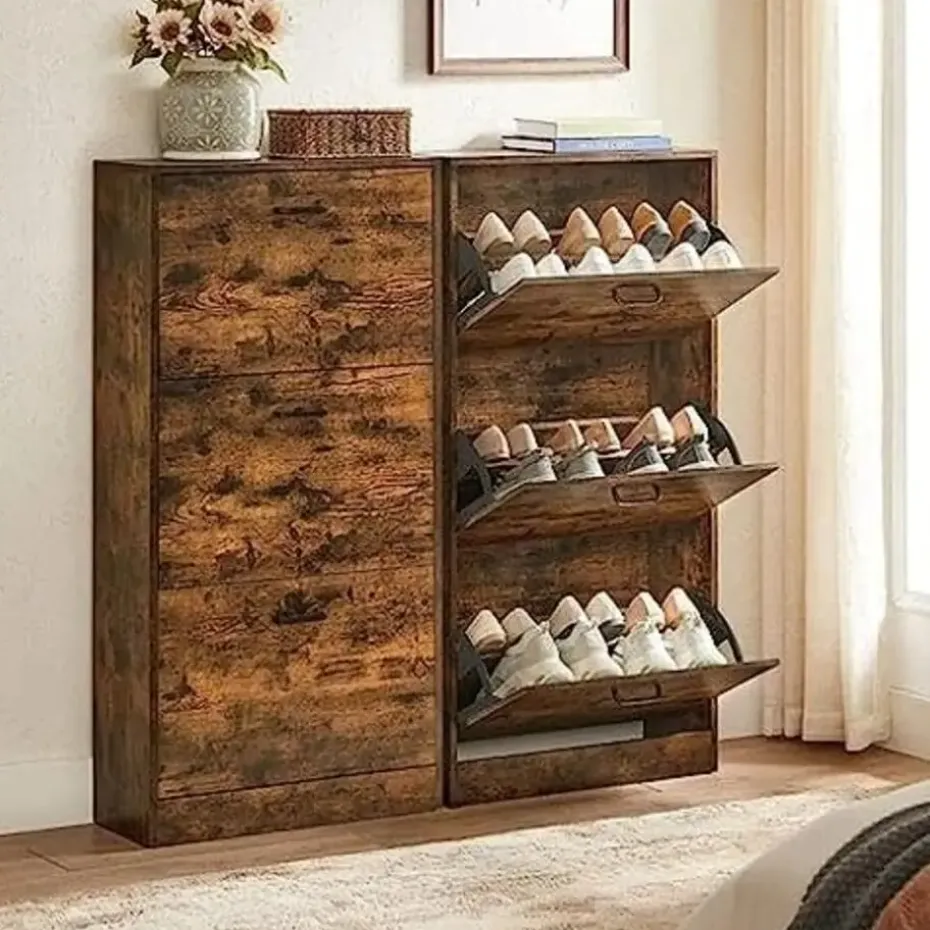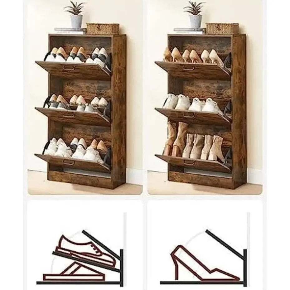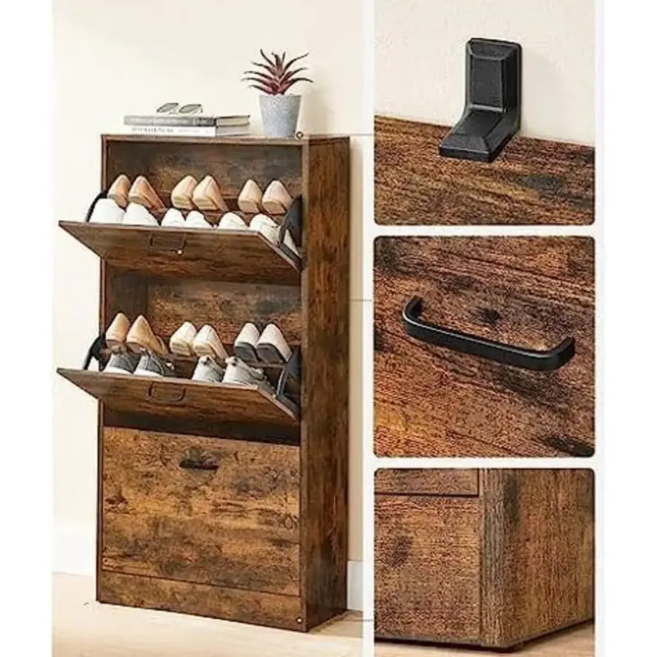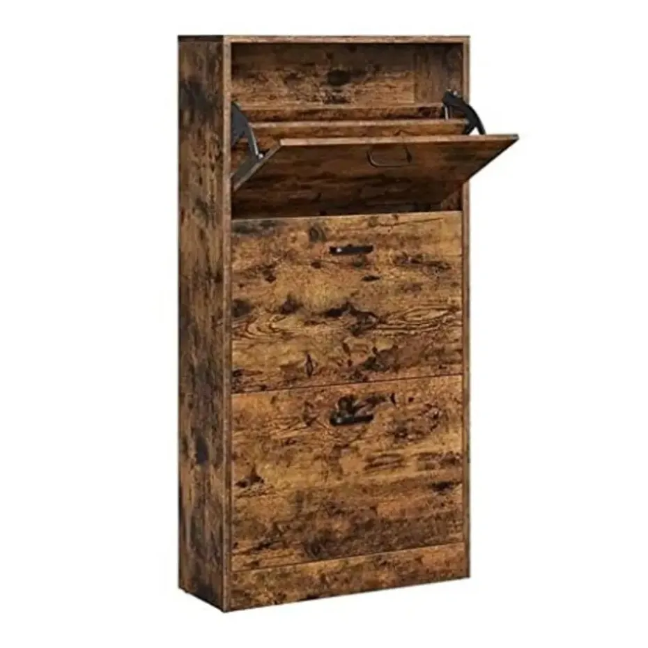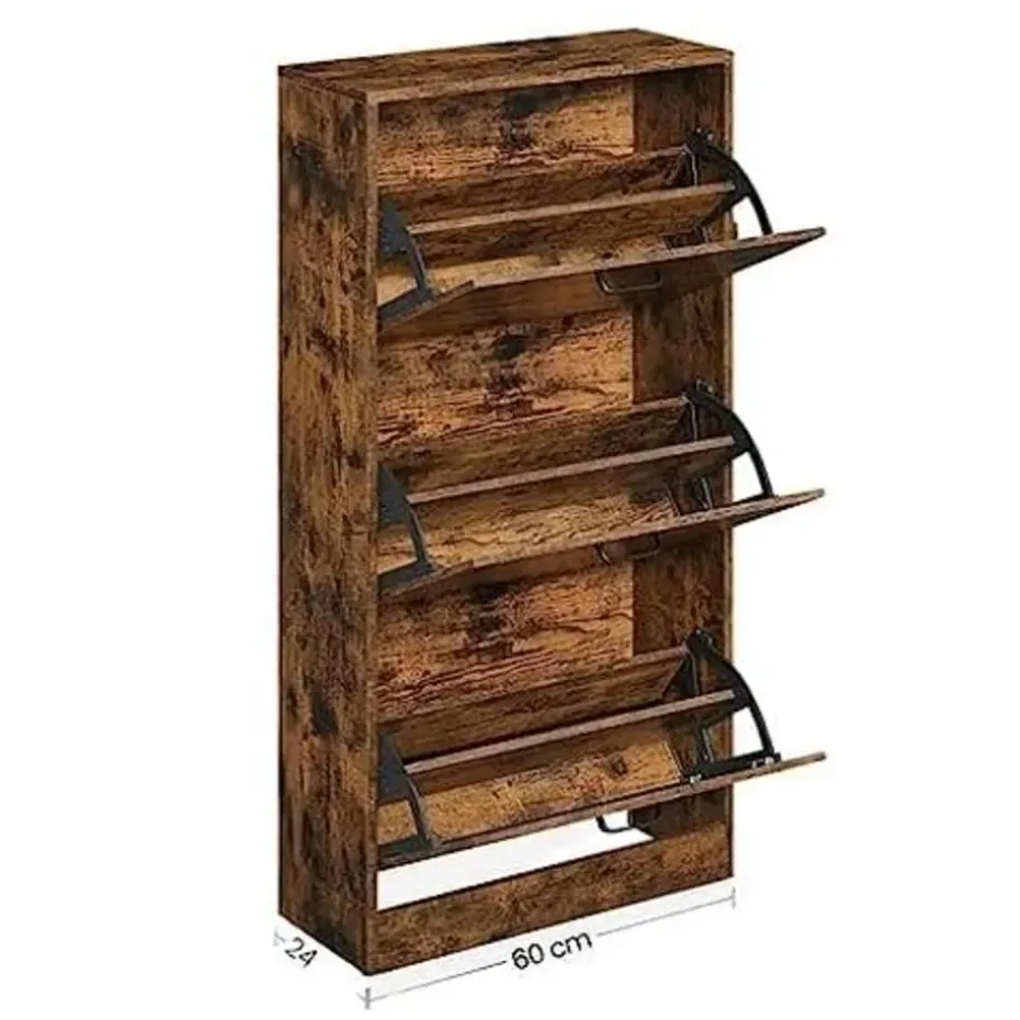 Benut je kleine ruimte optimaal met de slanke en stijlvolle Schoenenkast Met 3 Klapdeuren. Deze houten opbergkast met 3 verdiepingen is de perfecte aanvulling voor elke smalle entree, gang, woonkamer of slaapkamer en biedt een efficiënte en stijlvolle oplossing voor het opbergen en organiseren van al je schoenen. Het modernistische ontwerp en de rustieke bruine kleur maken deze schoenenkast een prachtige aanvulling voor elk huis. Bovendien maximaliseert het slanke ontwerp de verticale ruimte met behoud van gemakkelijke toegang tot je schoenen, zodat je ze gemakkelijk kunt pakken en meenemen. Met 3 dubbele uitklapbare lades kun je in dit slimme schoenenrek gemakkelijk 18 paar damesschoenen, 12 herenschoenen of een mix van beide kwijt! Bovendien kunnen de verstelbare verdelers uit elke lade worden verwijderd, voor nog meer opslagflexibiliteit – geen stapels schoenen meer in zicht! Deze schoenenopslag is ontworpen om zowel stevig als veilig te zijn; de stevige structuur is verbonden door 3-in-1 schroeven, die de afwijking en scheuren veroorzaakt door zelftappende schroeven elimineert en de sterkte voor jaren verzekert; de anti-tip kit verbetert de algehele stabiliteit nog meer.Het product meet 60 x 24 x 120 cm (L x B x H) en weegt 21,5 kg. Deze mooie schoenenopberger wordt geleverd met een complete set accessoires, inclusief genummerde onderdelen voor eenvoudige montage. Na de montage kun je snel je entree, slaapkamer of kast opruimen met deze chique en effectieve schoenenkast.