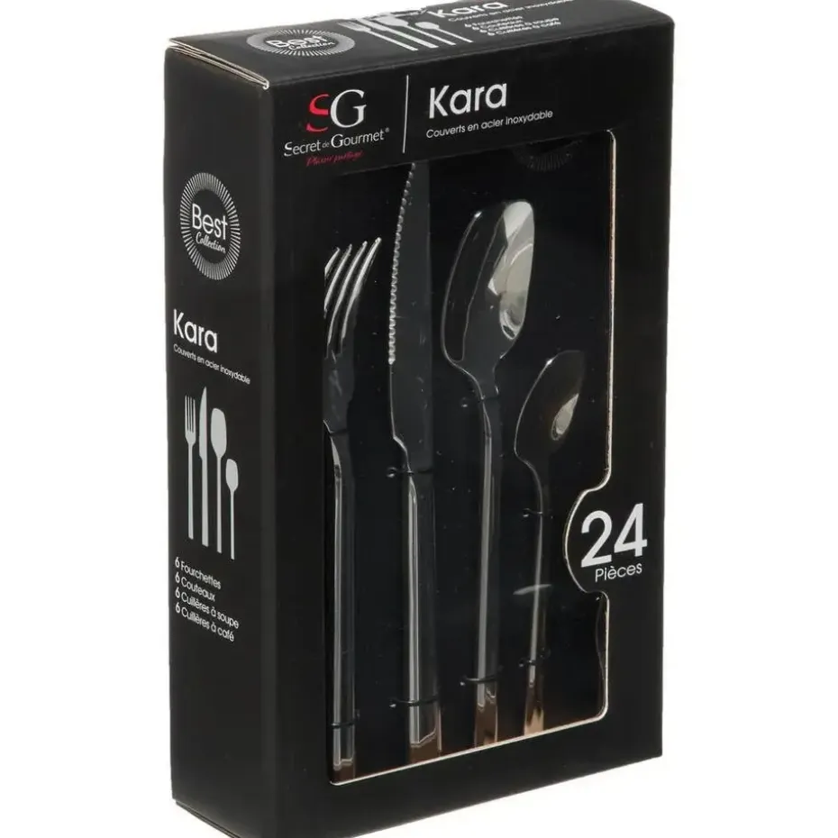 24-Delige bestekset Kara. Dek de tafel met deze moderne complete bestekset geschikt voor 6 personen. De set bestaat uit 6x snijmessen, 6x vorken, 6x lepels en 6x koffie/theelepeltjes. Materiaal: RVS. Vaatwasserbestendig.