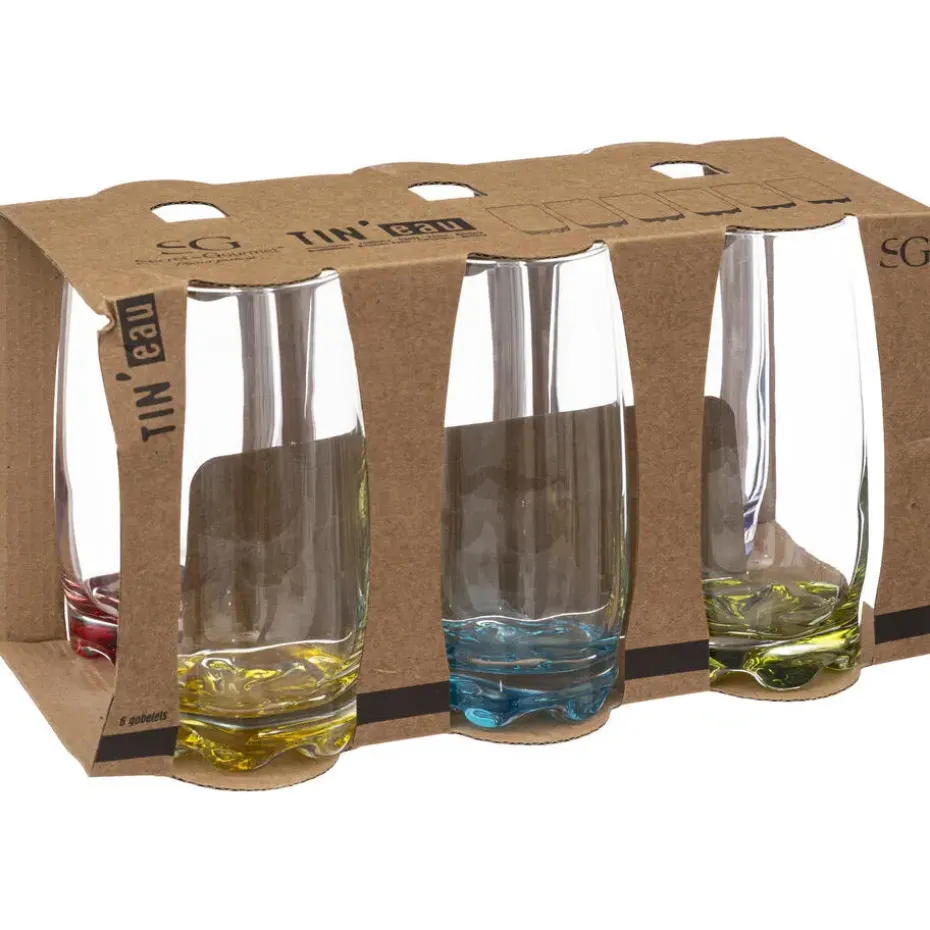 Set van 6x stuks kleurrijke drinkglazen/waterglazen. Deze drinkglazen zijn perfect om uw heerlijke drank naar keuze op te drinken, daarnaast heeft elk glas een eigen kleur die een uniek karakter geeft aan de bodem van elk glas. Inhoud per glas: 380 ml. Diameter 9 cm. Hoogte: 15 cm. Kleur: divers. Materiaal: glas.