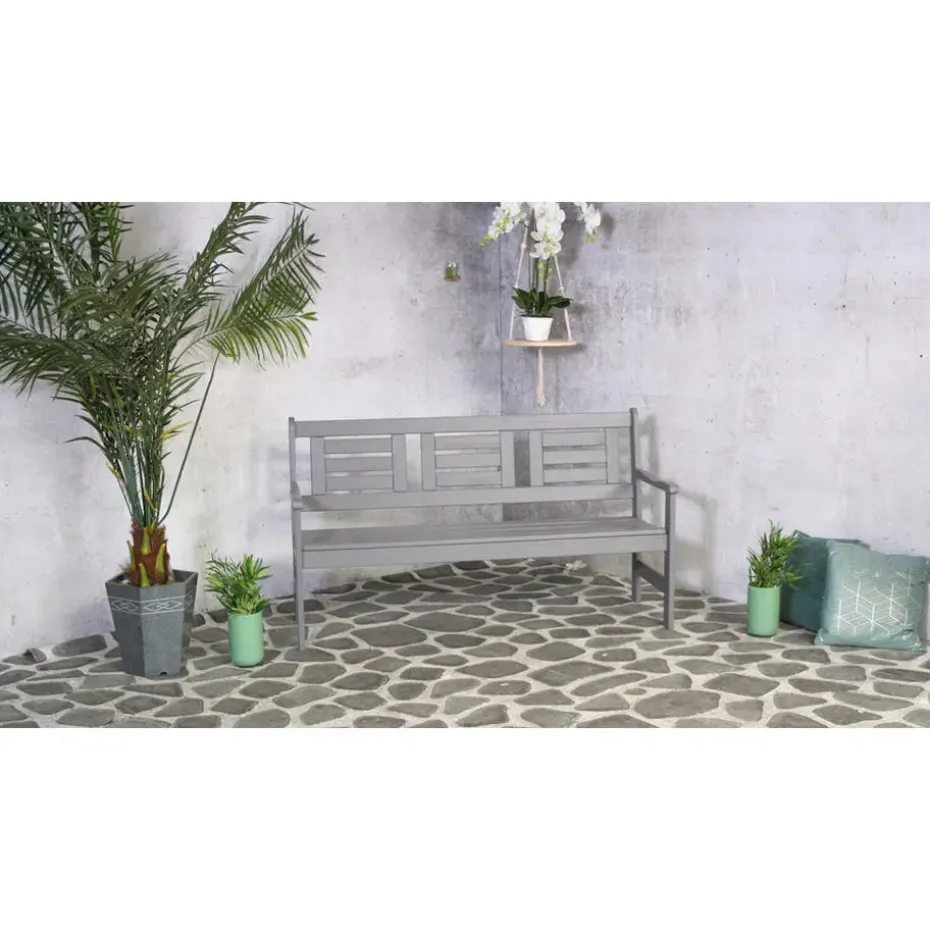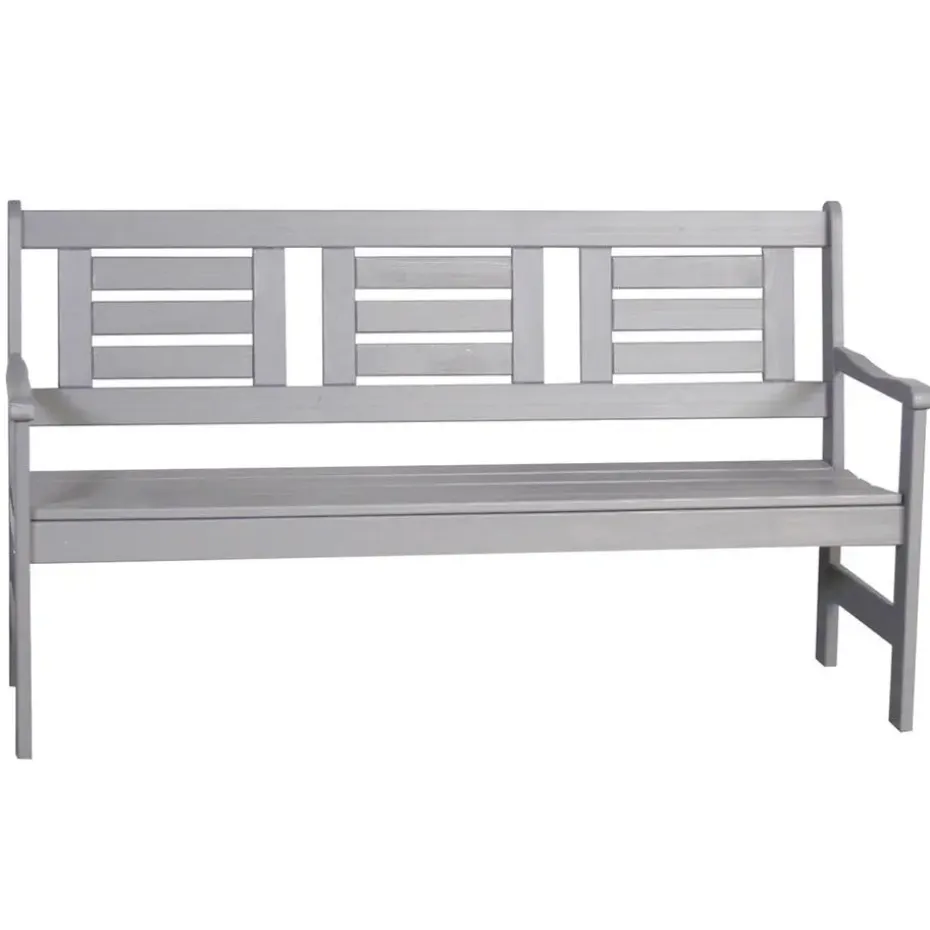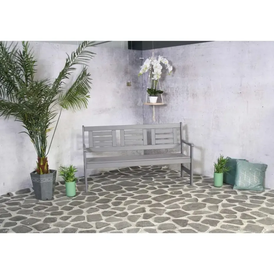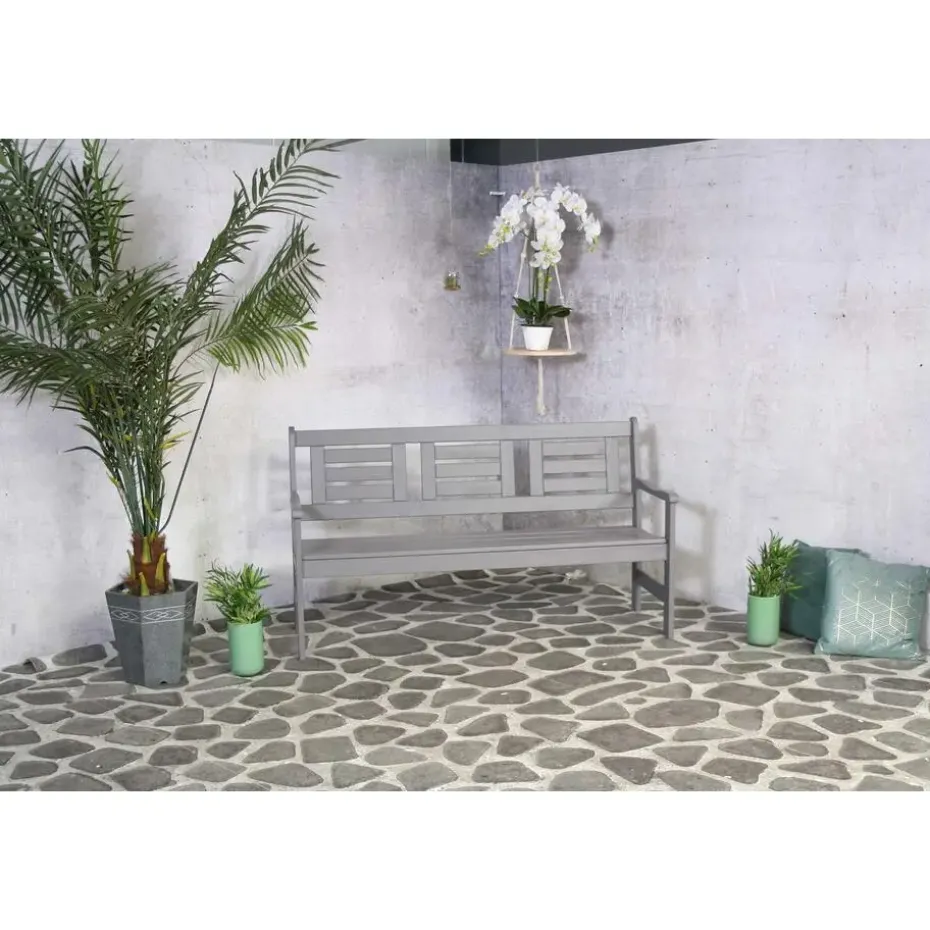 De compacte bank biedt 3 zitplaatsen voor in je (kleine) tuin, balkon of voortuin. De strak vormgegeven tuinbank is gemaakt van grenenhout en is gebeitst in een grijze kleur. Het 100% FSC gecertificeerde hout heeft een lange levensduur.