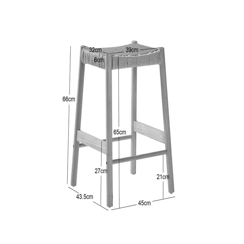 Afmetingen product (L x B x H) = 45 x 43,5 x 66 cm; Zithoogte: 65 cm; Zitdiepte: 32 cm; Nettogewicht product: 8 kg; PCB: 2; Totale gewicht van de verpakking: 10 kg; Maximaal ondersteund gewicht: 120 kg; Zitcapaciteit: 1 persoon; Product om te monteren: Ja; Stapelbaar product: Nee; Certificering 1: FSC; Houtafwerking: gelakt; Afmetingen verpakking (L x B x H) = 51,5 x 50 x 70 cm.