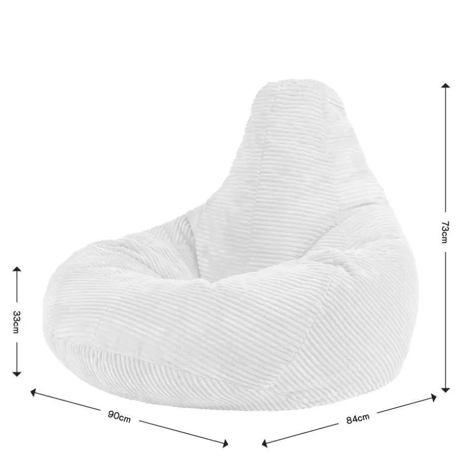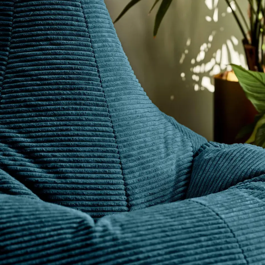 RELAX EN LEUN ACHTEROVER; Deze zitzakzetel is gemaakt om lang in te zitten, vervaardigd in super zacht corduroy en gevuld met precies de juiste hoeveelheid kralen voor een perfect ondersteunend inzakeffect.