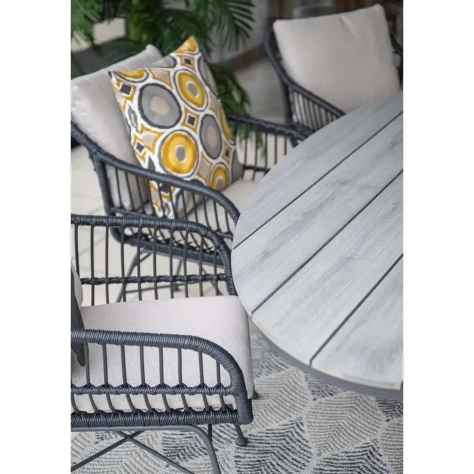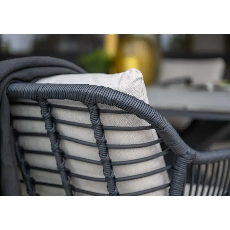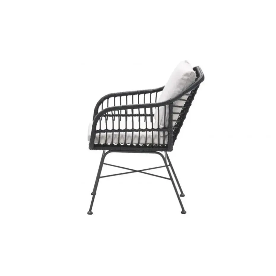 Het frame van de Margriet tuinstoel is gemaakt van staal. Een onderhoudsvriendelijk materiaal dat bestand is tegen de meeste weersinvloeden. Daarbij is het licht van gewicht en erg stevig! Om het frame is zwart wicker gevlochten. Dit geeft de unieke uitstraling aan deze stoel. De meegeleverde kussens hebben een zandkleur die helemaal van deze tijd is. De kussens hebben ook een waterafstotende coating. Dit betekend niet dat ze waterdicht zijn, wel kan je gemorst drinken er zo vanaf vegen!