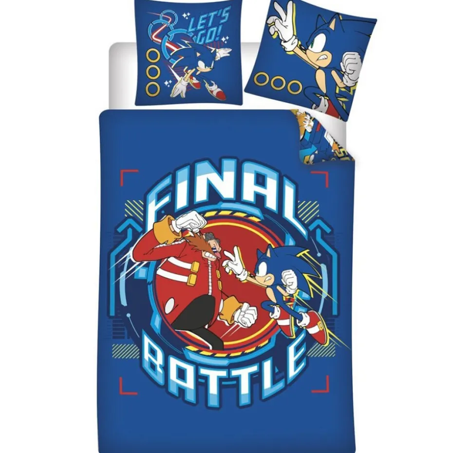 Sonic dekbedovertrek, Final Battle. Stoer, katoenen dekbedovertrek van Sonic the Hedgehog. Dit buitenaardse blauwe wezen gaat het ultieme gevecht aan met Doctor Ivo Robotnik a.k.a. Doctor Eggman. Een waanzinnig tof dekbedovertrek, met een dubbelzijdige bedrukking en een bijpassend kussensloop (ook tweezijdig te gebruiken). Een leuk cadeau-idee voor elke liefhebber van de spellen en films van Sonic.