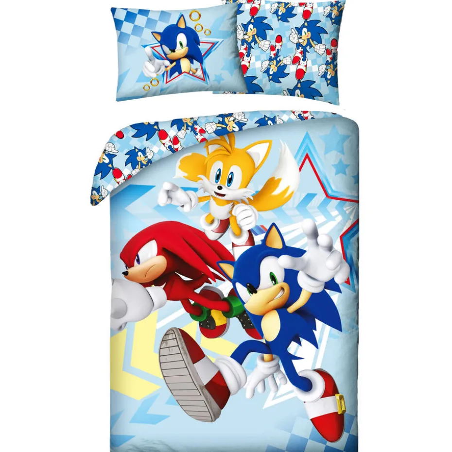Sonic Dekbedovertrek, Speed Friends. Waanzinning eenpersoons katoenen dekbedovertrek van de supersnelle vrienden. Wij zien natuurlijk Sonic in het midden, maar Knuckles en Miles “Tails” Prower zijn ook van de partij! Dit dekbedovertrek is geschikt voor elke fan van deze drie karakters. De katoenen stof maakt het dat de stof goed aanvoelt op de huid.