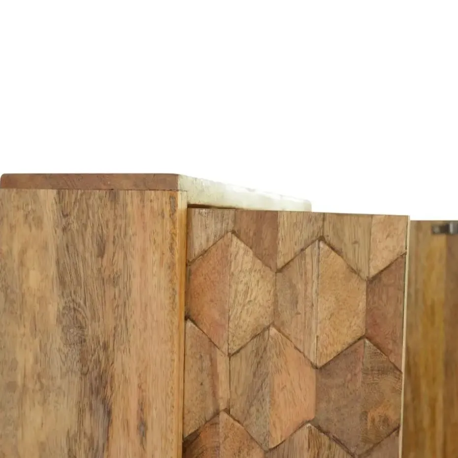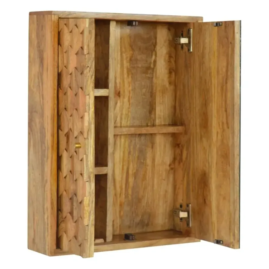 Voltooi uw assortiment met de spiegelkast, gemaakt van 100% massief mangohout in een eikenachtige afwerking, met een ananascarving aan de voorkant en een schuifspiegel. Het heeft een paar planken aan de binnenkant voor discreet opslaan van kleine spulletjes in de badkamer of de gang. Het zou geweldig staan, alleen of in combinatie met de andere stukken uit het assortiment. Het perfecte accessoire voor het huis.