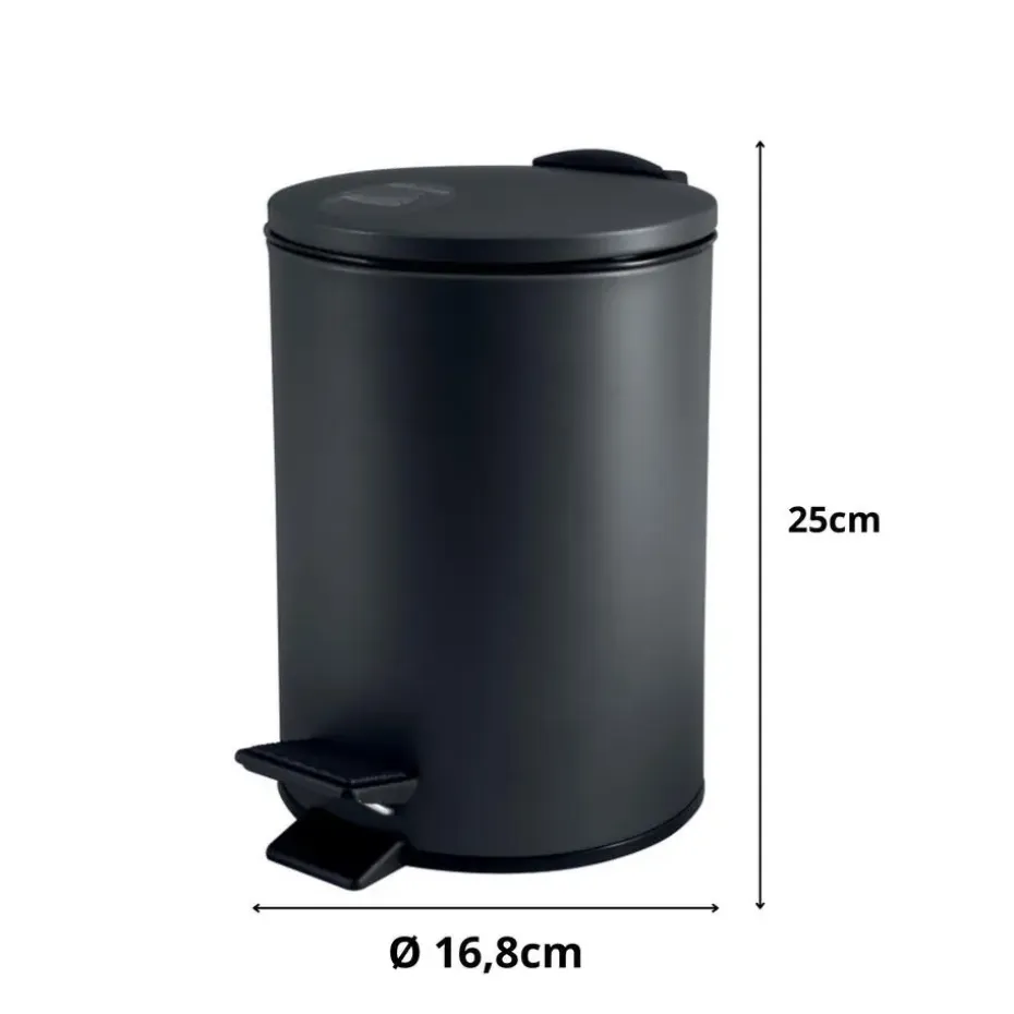 Pedaalemmer/prullenbak model Cannes voor in de badkamer en/of toilet, klein model met inhoud 3 liter. Kleur: zwart. Deze prullenbak is gemaakt van metaal en de deksel heeft een soft-close sluit systeem. Afmetingen zijn ongeveer L17 x H25 cm. Deze kleine pedaalemmers hebben een handige uitneembare binnenbak gemaakt van gerecycled plastic. Zeer goede kwaliteit materialen zijn gebruikt om deze kleine pedaalemmer een luxe uitstraling te geven.