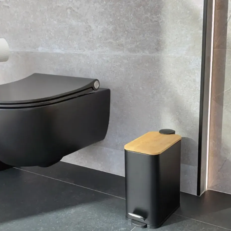 Pedaalemmer/prullenbak model Vienne met luxe bamboe deksel voor in de badkamer en/of toilet, klein model met inhoud 5 liter. Kleur: zwart. Deze prullenbak is gemaakt van metaal en de deksel heeft een soft-close sluit systeem. Afmetingen zijn ongeveer L28 x B14 x H29 cm. Deze kleine pedaalemmers hebben een handige uitneembare binnenbak gemaakt van gerecycled plastic. Zeer goede kwaliteit materialen zijn gebruikt om deze kleine pedaalemmer een luxe uitstraling te geven.