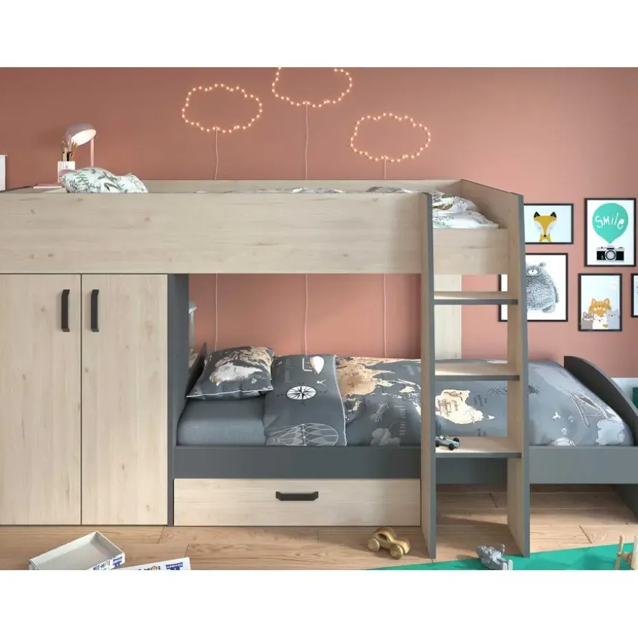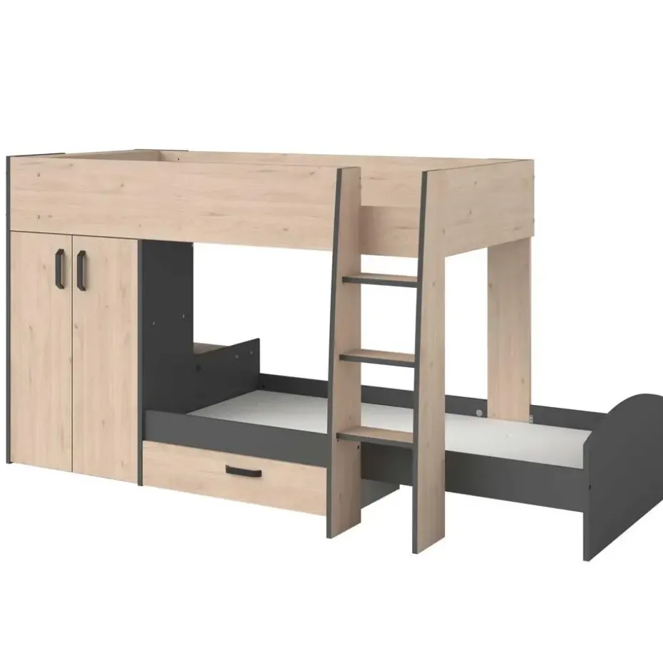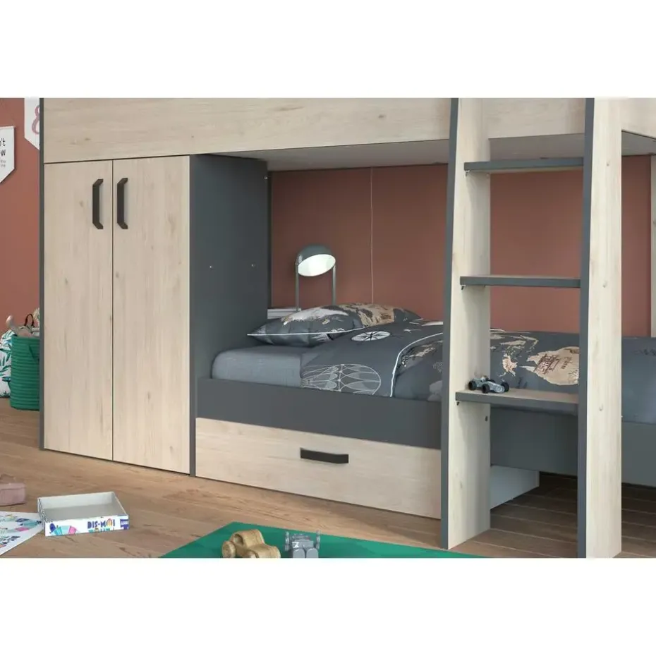 Stapelbed Stim is gemaakt van spaanplaat en werd bekleed met een papieren imitatiedecor van eik. De donkergrijze accenten vormen een stijlvol contrast met het warme eikdecor.