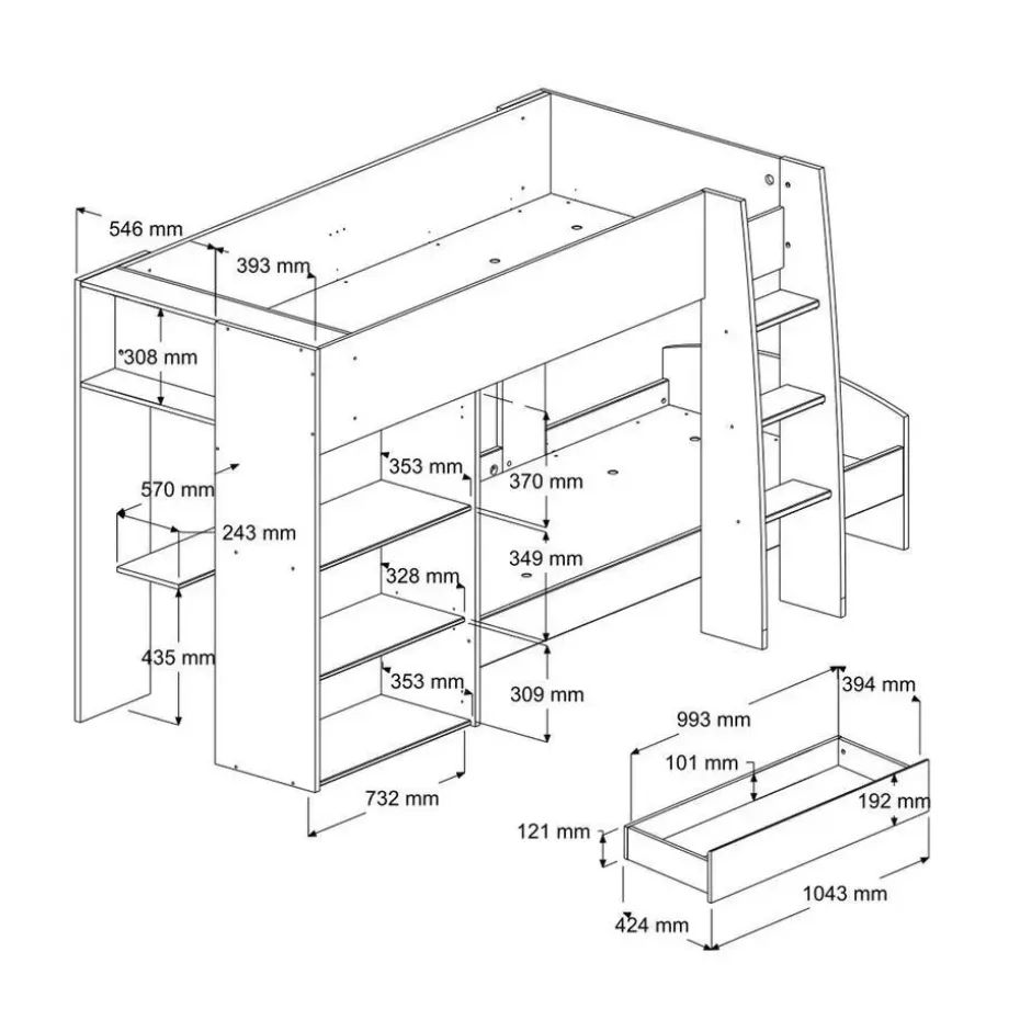 Wie valt niet voor het atypische design van stapelbed Stim? Dit bed beschikt niet alleen over 2 slaapplaatsen van 90×200 cm, maar ook over heel wat opbergmogelijkheden zoals: