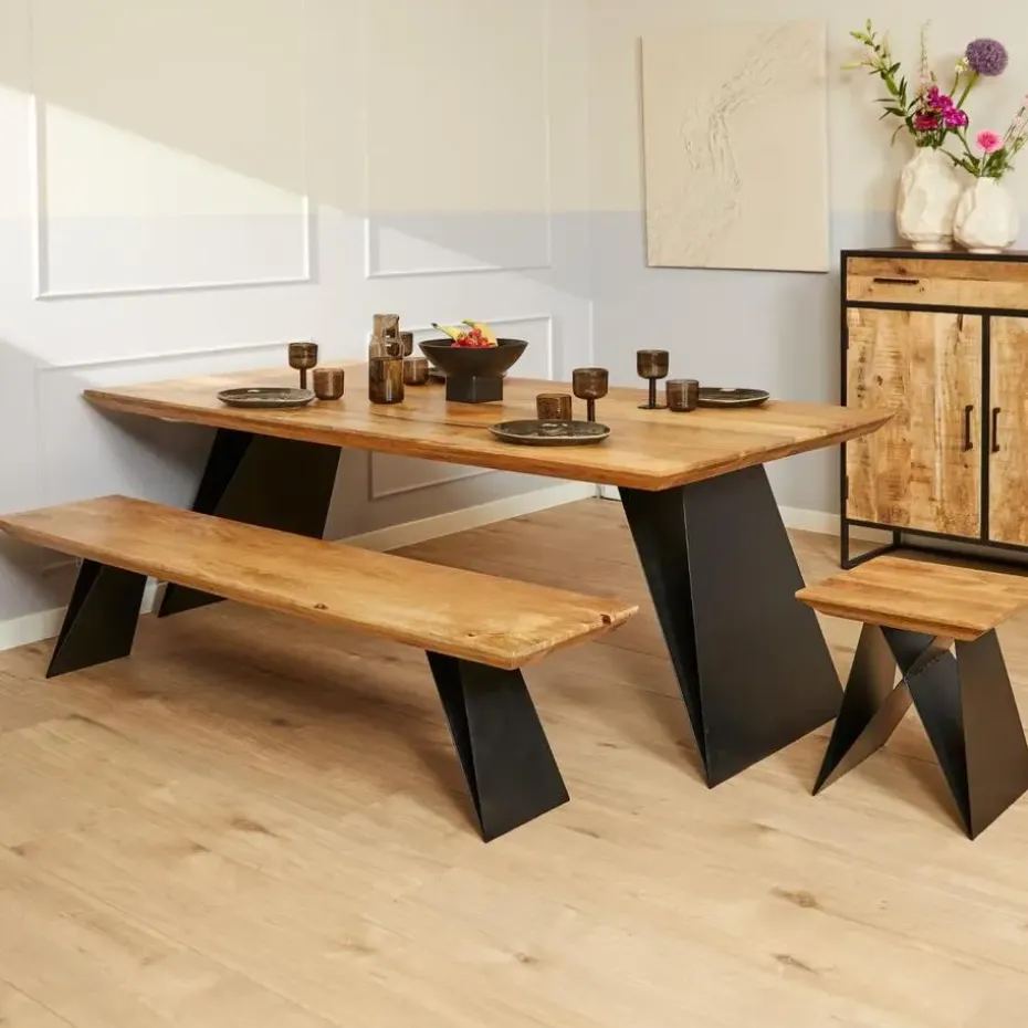 Deze kruk is gemaakt van mangohout met een metalen onderstel, wat zorgt voor een stijlvolle en duurzame constructie.