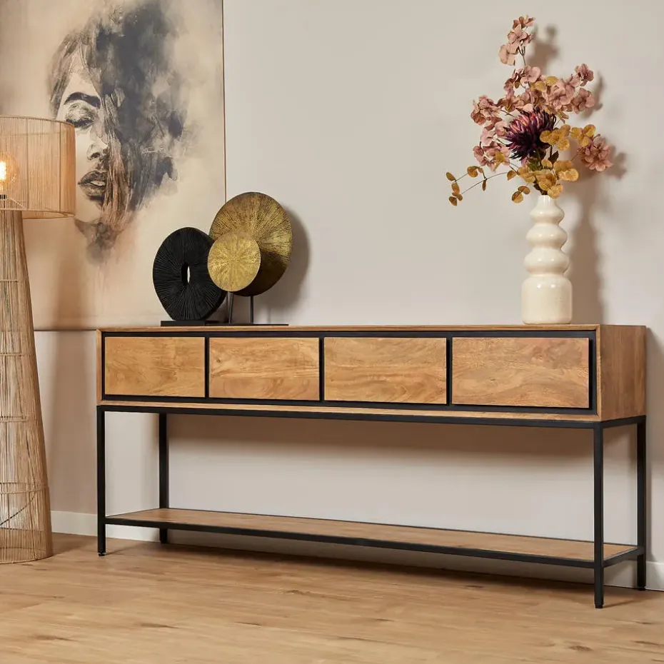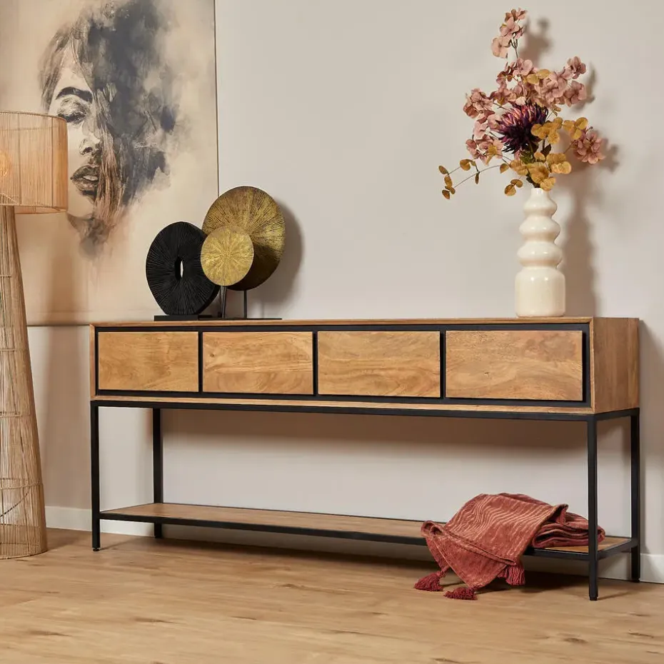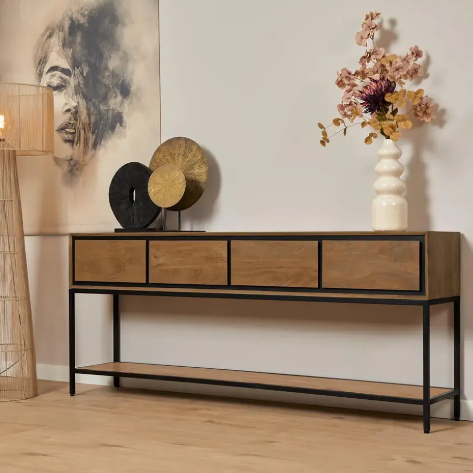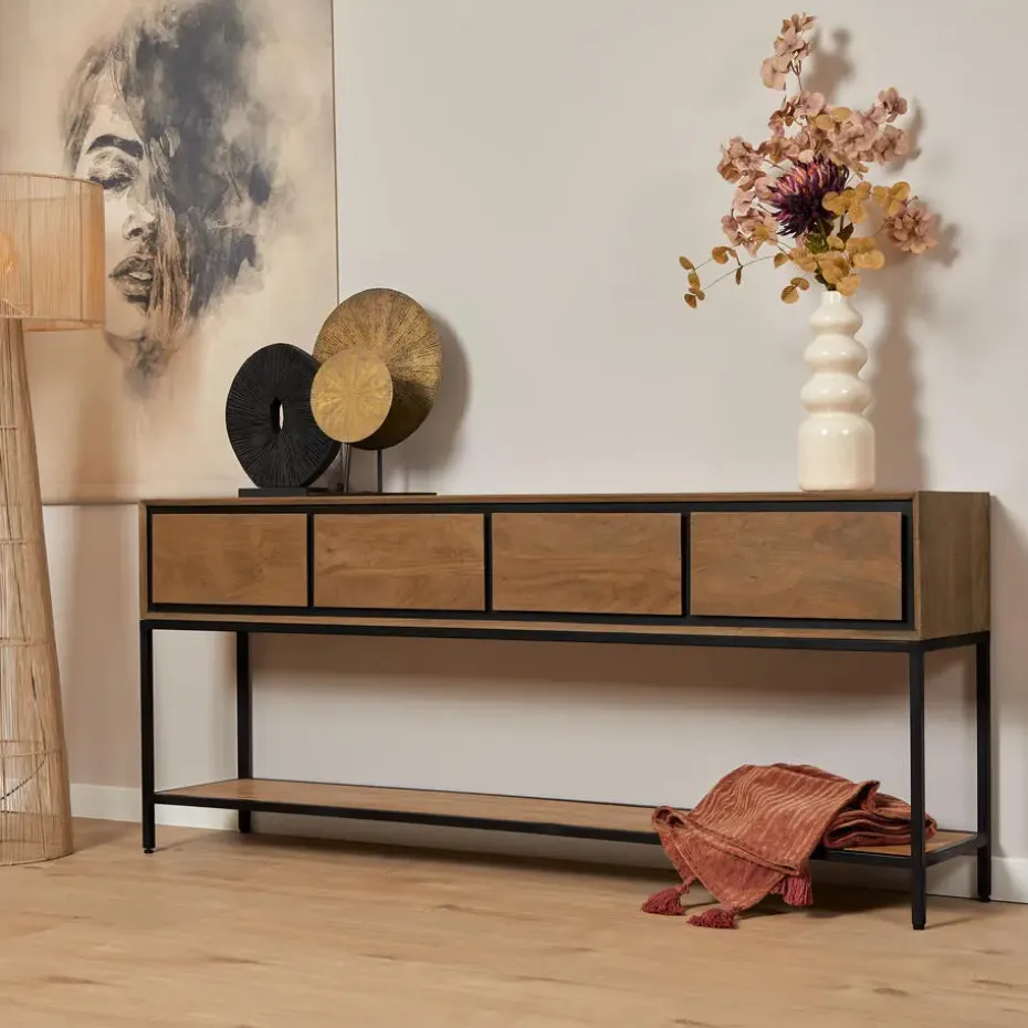 Sidetable RichWood is gemaakt van gelakt mangohout en heeft een zwart gelakt metalen frame. Dit stijlvolle meubel van 180 cm beschikt over vier greeploze lades en een legplank , wat zorgt voor een strakke en moderne uitstraling. De ingelegde houten stroken geven het sidetable een uniek en eigentijds karakter. Sidetable RichWood maakt deel uit van de RichWood woonserie van Starfurn.