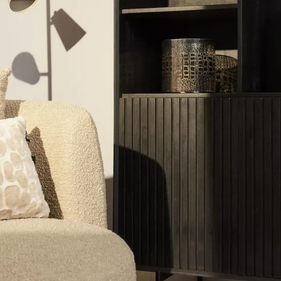 De vakkenkast is gemaakt van mangohout en heeft een metalen frame dat is afgewerkt met een zwarte lak. Het verticale lattenpatroon op de deuren geeft het meubel een unieke en stijlvolle uitstraling.