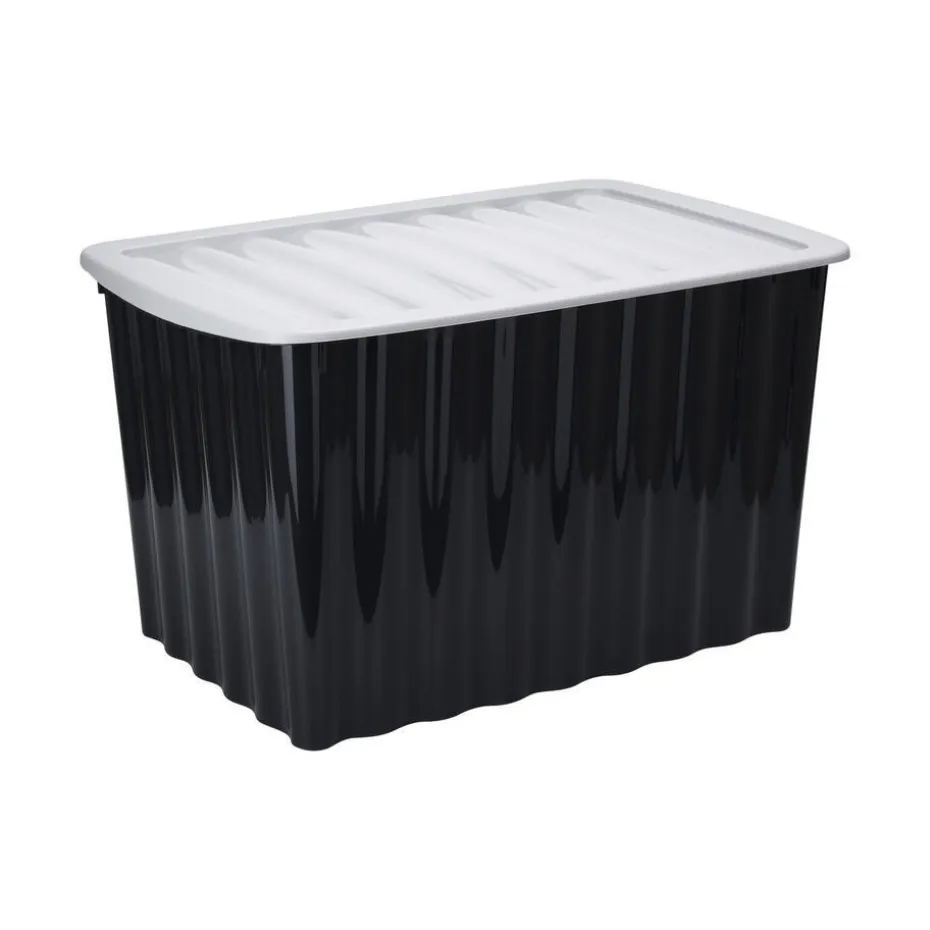 Opslagbak/opbergdoos/organizer kunststof transparant met antraciet deksel. Deze handige opberg box/doos is een kast-organizer en is uitermate geschikt om bijvoorbeeld speelgoed of kerstspullen in op te ruimen. De deksel is gemakkelijk dicht te klikken. Afmeting: ca. 60 x 40 x 35 cm. Inhoud: ca. 84 liter. Materiaal: polypropyleen.