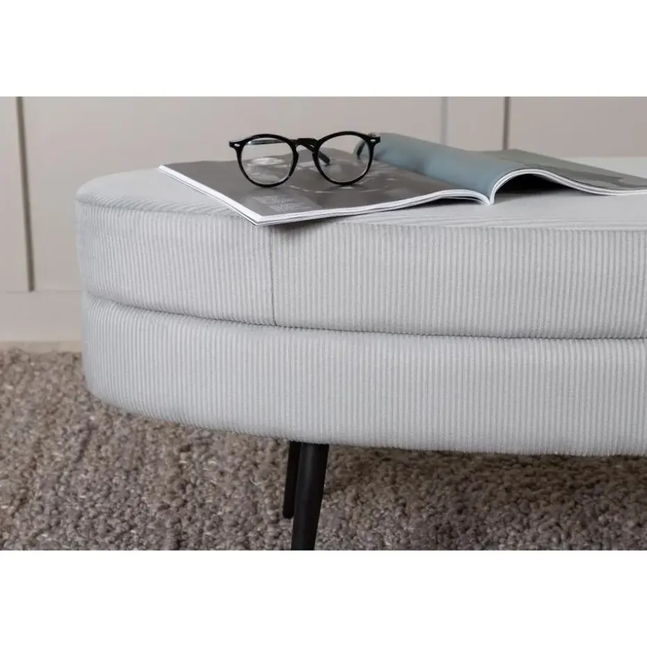 Laat modern design de nostalgie van de jaren ’50 ontmoeten met deze trendy Axel hocker – rib – grijs! Gekleed in lichtgrijze fluwelen stof, geeft de zitpoef een moderne uitstraling aan de woonkamer. Het ovale maar tegelijkertijd zachte ontwerp en de smalle, uitlopende poten van zwart staal creëren een luchtig en uitnodigend gevoel. Een ongelooflijk doordacht totaalontwerp dat het mogelijk maakt om het meubel zowel solitair als naast een bankgroep te plaatsen. Gemaakt van grijze kleur en de materialen schuim, katoenvezel, stof, gebogen hout en staal. Afmetingen van de poef: Lengte: 100 cm, breedte: 40 cm, hoogte: 41 cm.