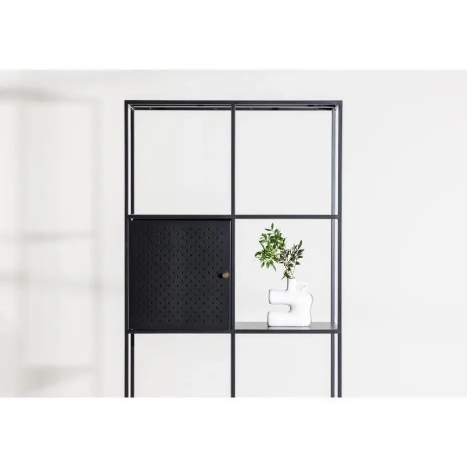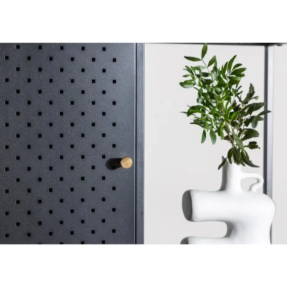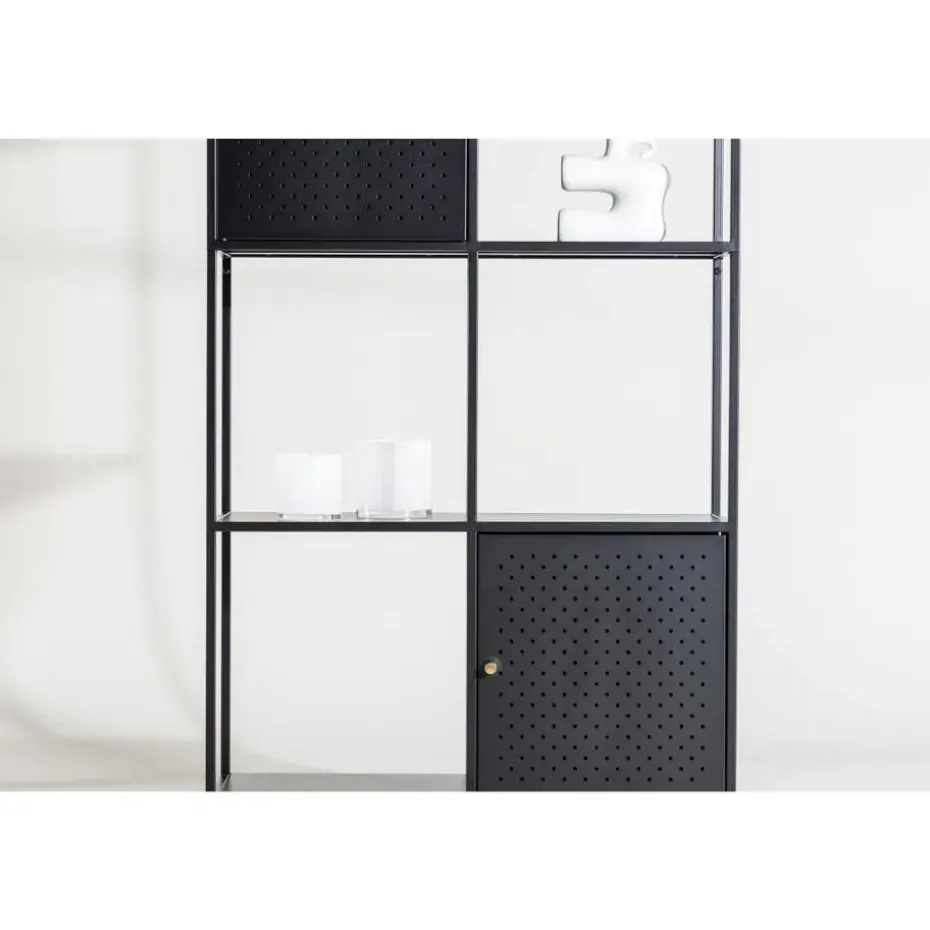 Met zijn hoge en smalle ontwerp biedt dit rek een unieke combinatie van open en verborgen opbergruimte op zijn vier ruime planken. Twee kasten, geplaatst op verschillende hoogtes met elegante messingkleurige knoppen, bieden de perfecte plek om kleine items weg te bergen en een georganiseerde oppervlakte te creëren. De open planken zijn ontworpen om jouw mooie decoraties of kaarshouders te tonen, wat een gevoel van gezelligheid brengt.